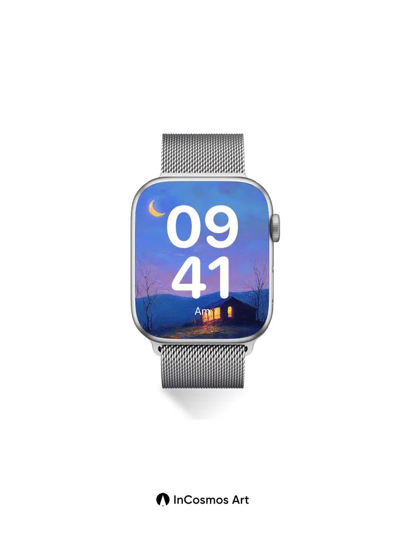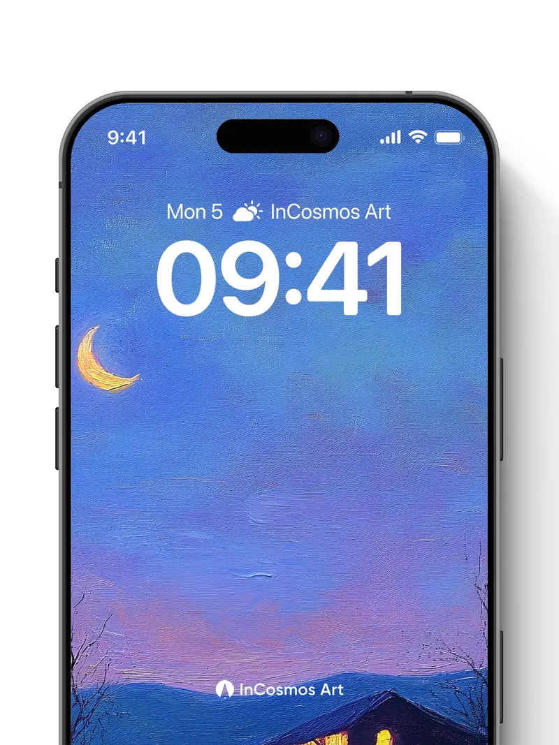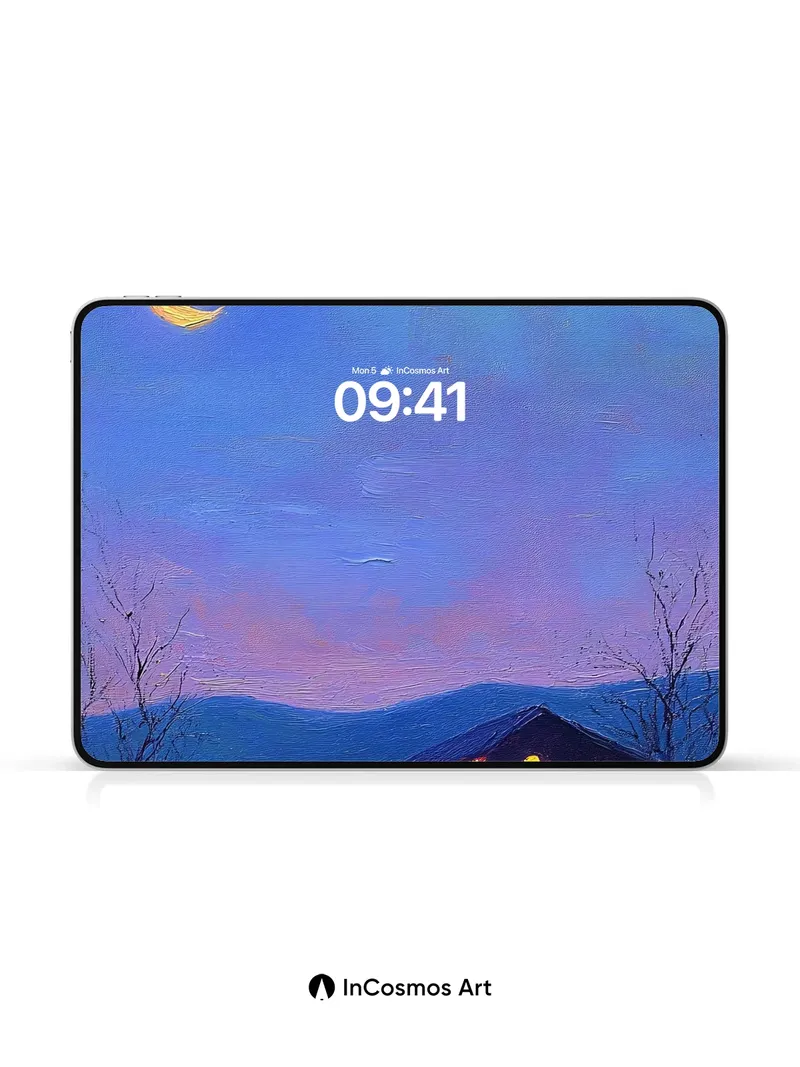 Debug product.metafields.custom.desc: Did you know the first known depiction of a crescent moon in art dates back to Mesopotamian clay tablets? Here, it hangs like a golden thread against a twilight sky that shifts from indigo to lavender, while light spills from a solitary cabin’s windows—warm, amber, and alive. The grass beneath breathes in shadowed hues, each blade painted with quiet intention, as if the night itself is holding its breath.