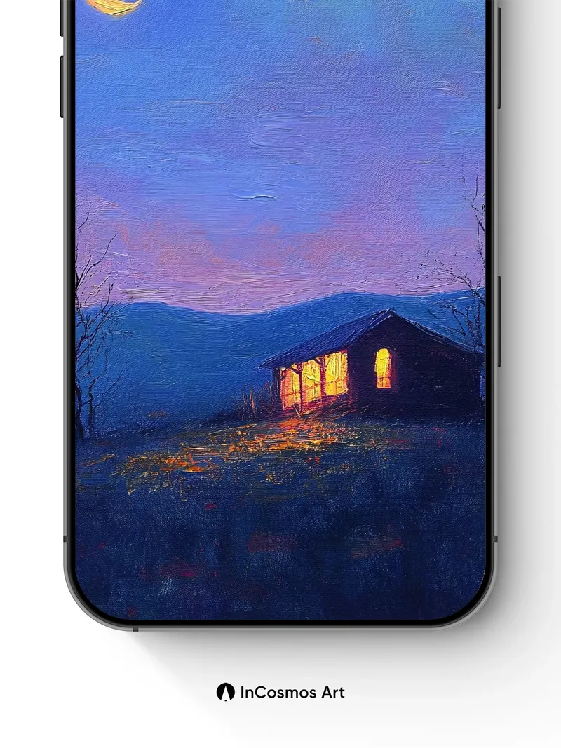 Did you know the first known depiction of a crescent moon in art dates back to Mesopotamian clay tablets? Here, it hangs like a golden thread against a twilight sky that shifts from indigo to lavender, while light spills from a solitary cabin’s windows—warm, amber, and alive. The grass beneath breathes in shadowed hues, each blade painted with quiet intention, as if the night itself is holding its breath.