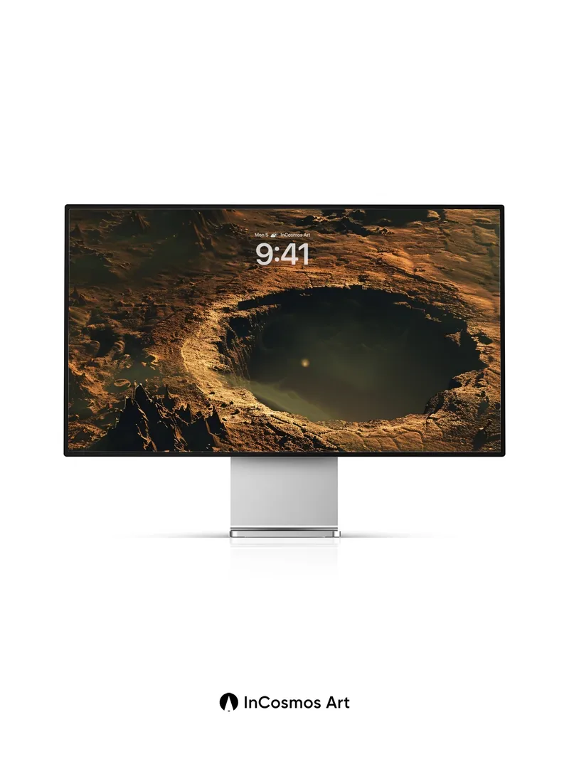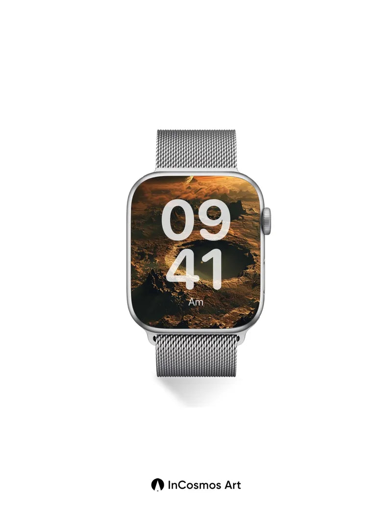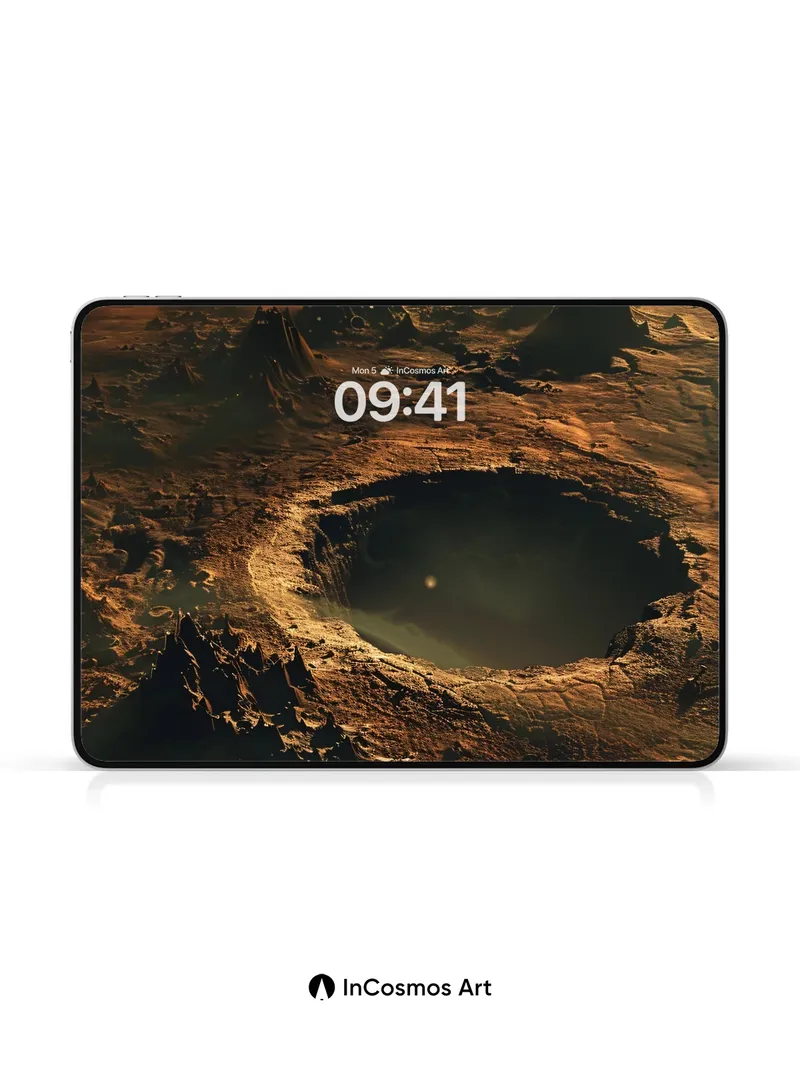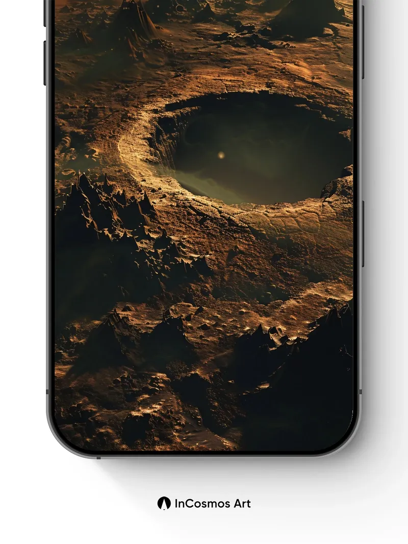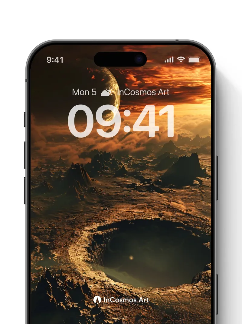 Debug product.metafields.custom.desc: Did you know that impact craters on distant planets can hold traces of ancient oceans? Here, light crawls over rusted stone like a slow ember, carving deep shadows into the rim of a vast, silent basin beneath a blood-orange sky. A half-lit moon hangs low, casting an otherworldly glow across jagged peaks and swirling clouds that breathe with the heat of a dying sun.