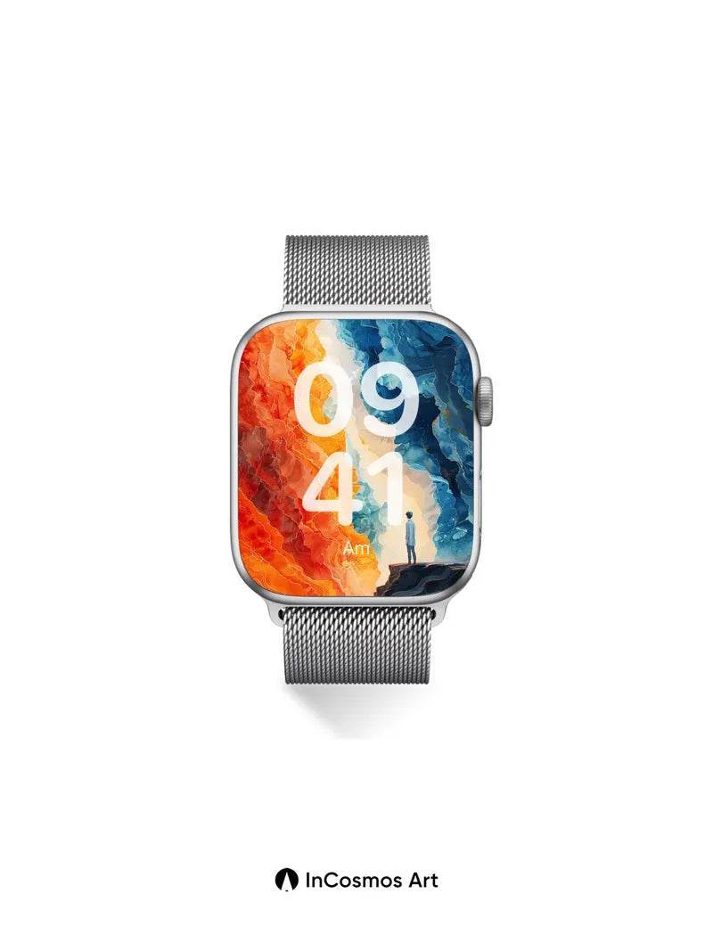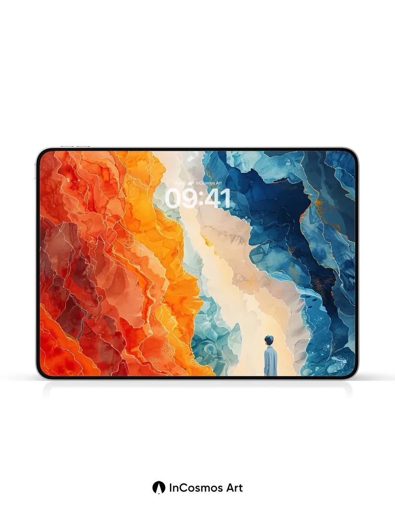 Debug product.metafields.custom.desc: Did you know that ancient cultures believed fire and water were eternal rivals, each born from the same breath of creation? Here, molten orange waves claw at icy blue abysses like living tectonic plates, their edges glowing where light bleeds through a narrow rift. A lone figure stands at the edge, not as observer but as witness—small, still, caught between worlds that pulse with unseen currents.