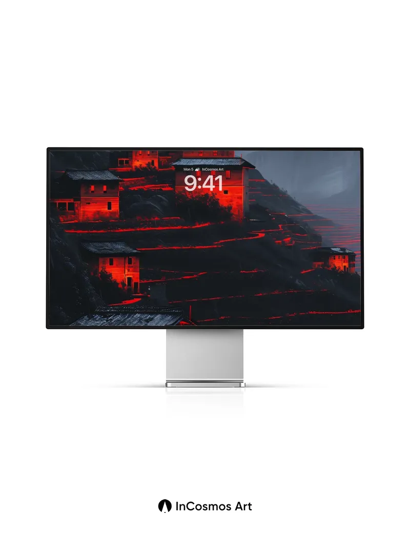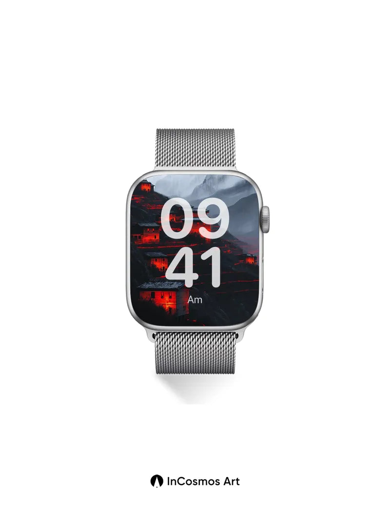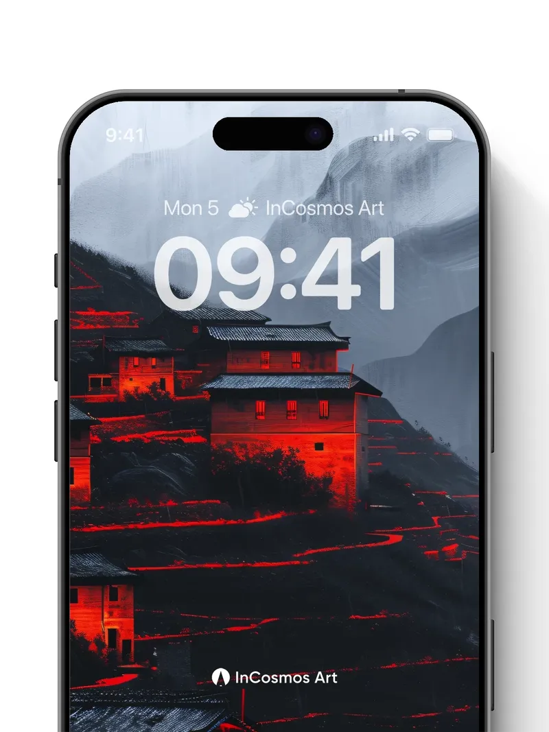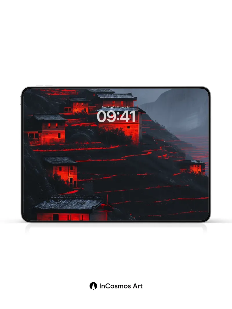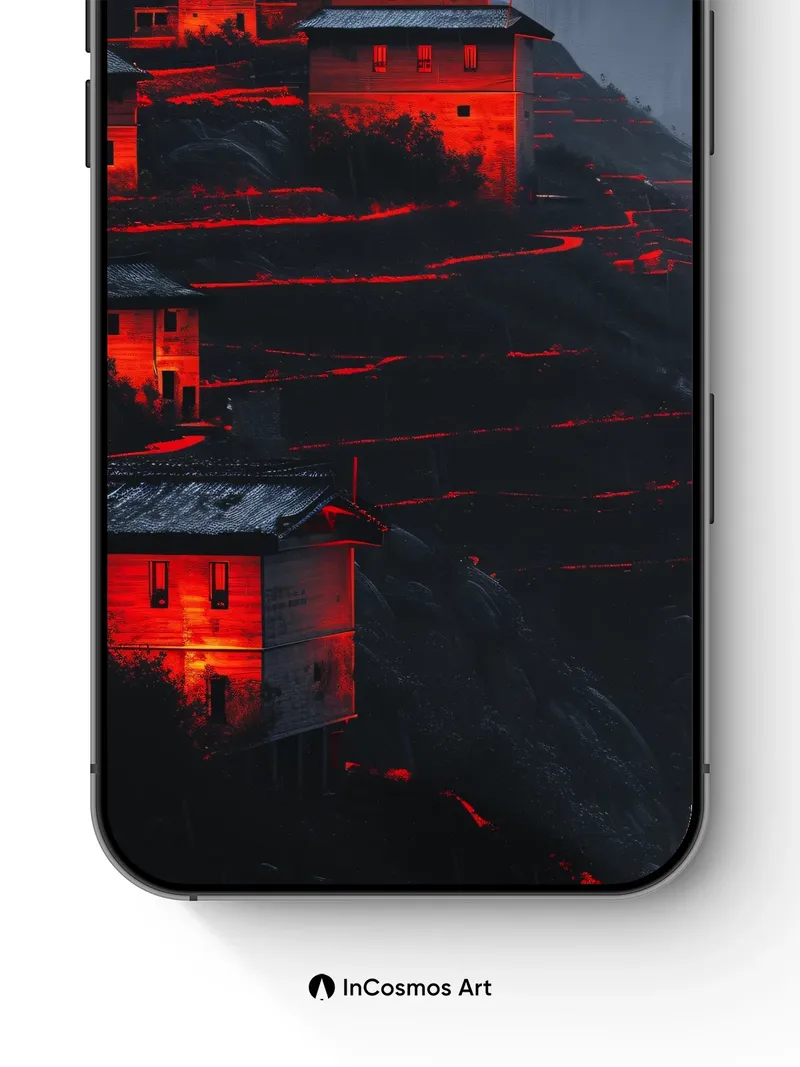 Debug product.metafields.custom.desc: Did you know that ancient terraced villages in the Himalayas were built to harness moonlight for farming? Here, fire-red light crawls over weathered stone and slate roofs like a living pulse, illuminating each tier of the slope as if the earth itself is breathing. The mist-clad peaks loom in silence, their shadows stretching into the valley like ink spilled across parchment—each house a flickering ember in the vastness.