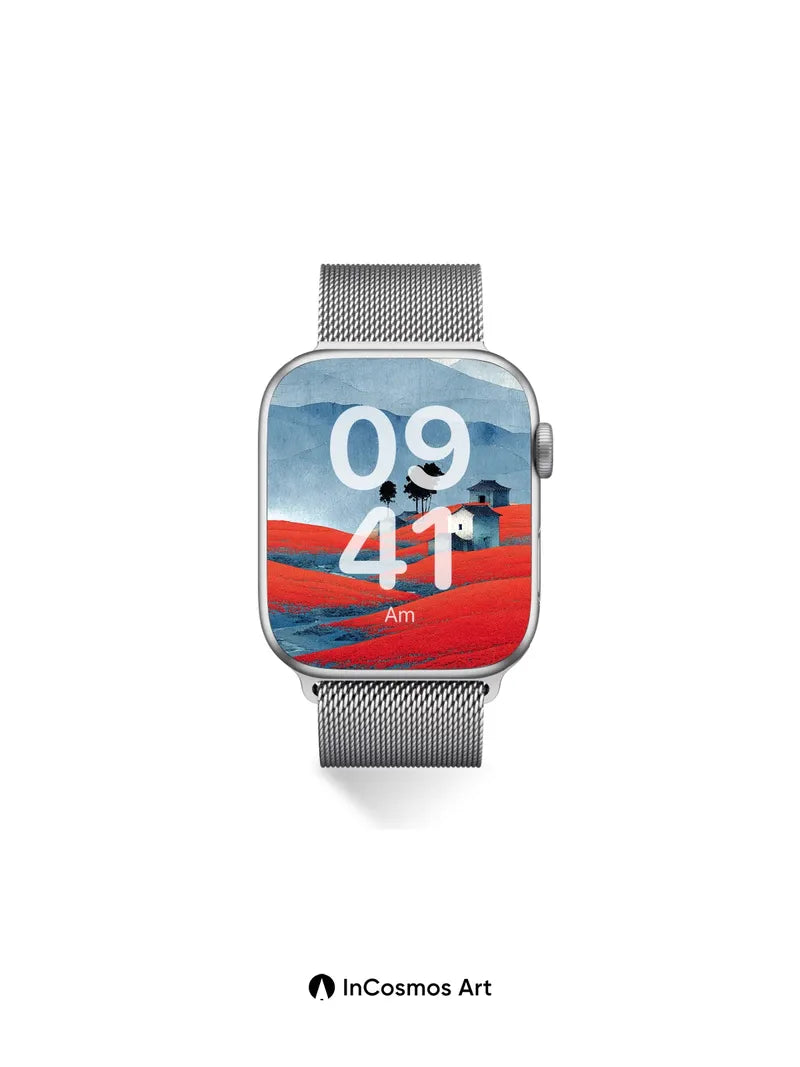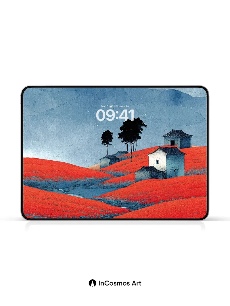 Crimson Field Wallpaper with Stone Huts and Misty Peaks