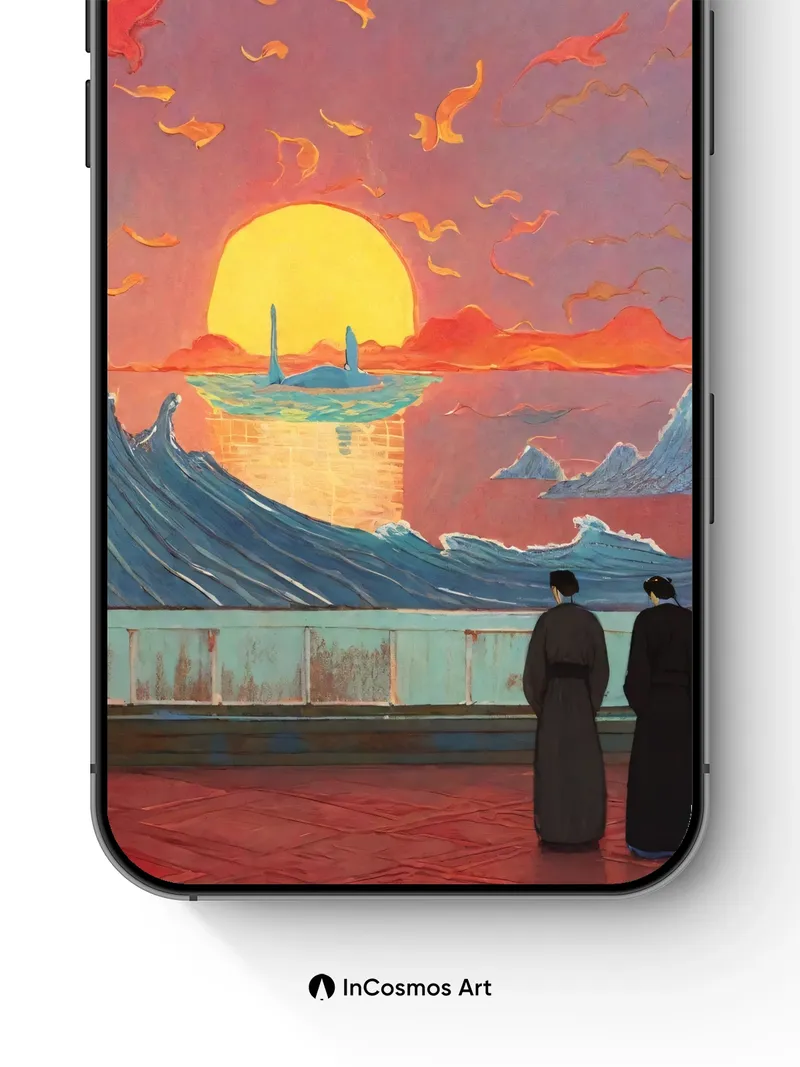 Debug product.metafields.custom.desc: Did you know the ancient Chinese believed firebirds carried souls to the sun? Here, they spiral upward like embers caught in a breath, their wings painted in molten orange and rust-red against a sky that bleeds into twilight. Below, waves curl like frozen silk, reflecting a golden orb that pulses as if it’s breathing—while two figures stand still, silhouetted in quiet reverence.