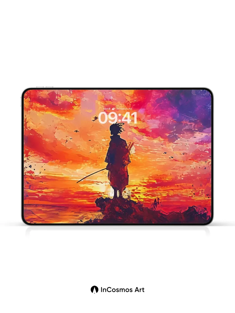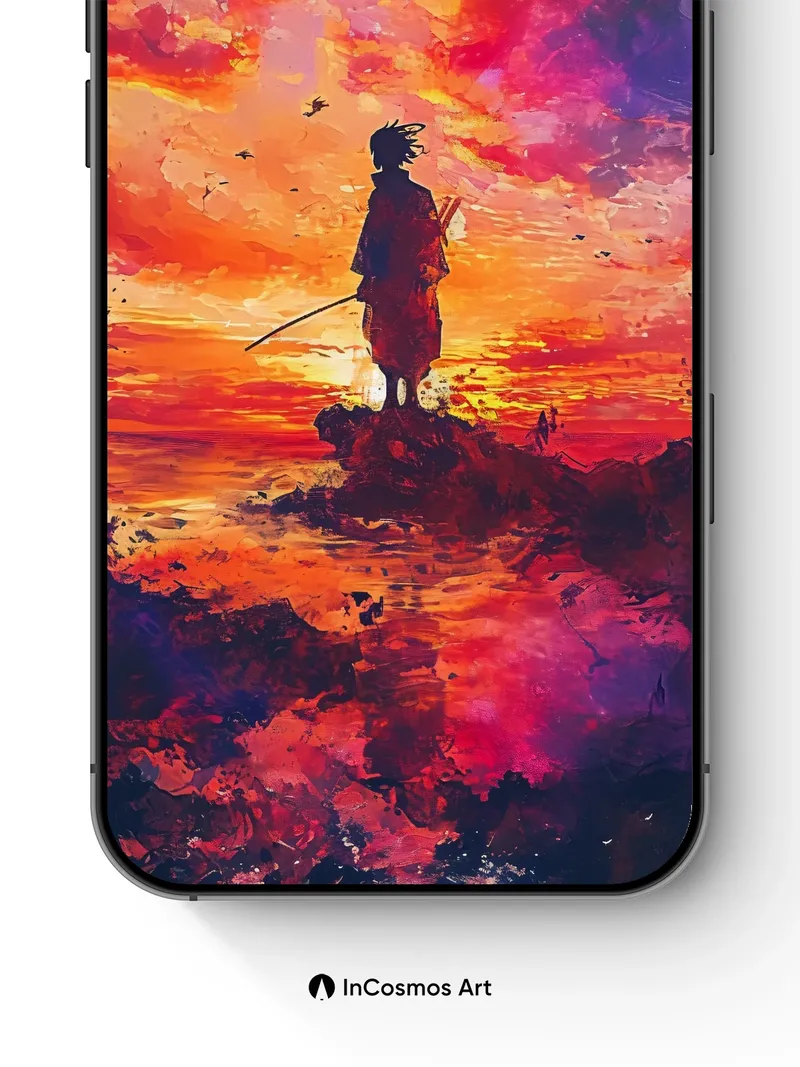 Debug page_description: Did you know that Japanese ink wash painters once used the same brushstrokes to capture both storm clouds and stillness? Here, fire-colored skies bleed into a reflective lake like molten glass, while a lone warrior stands motionless—his silhouette carved from shadow and memory. The wind carries whispers of ancient battles, but the sky sings only of endings and beginnings. Share this with your best friend. Send this to your love and swap a matching set. What would you say if the horizon answered back?