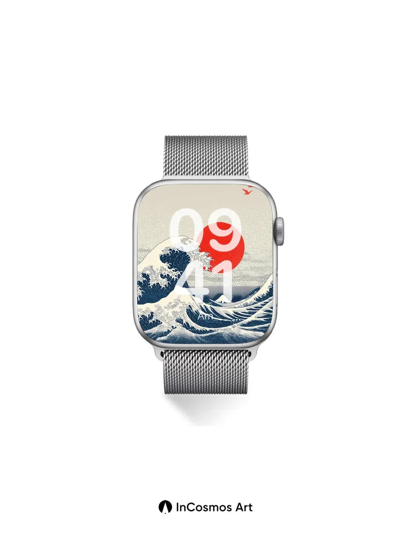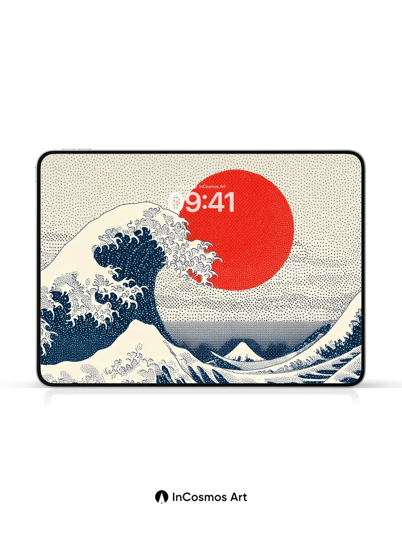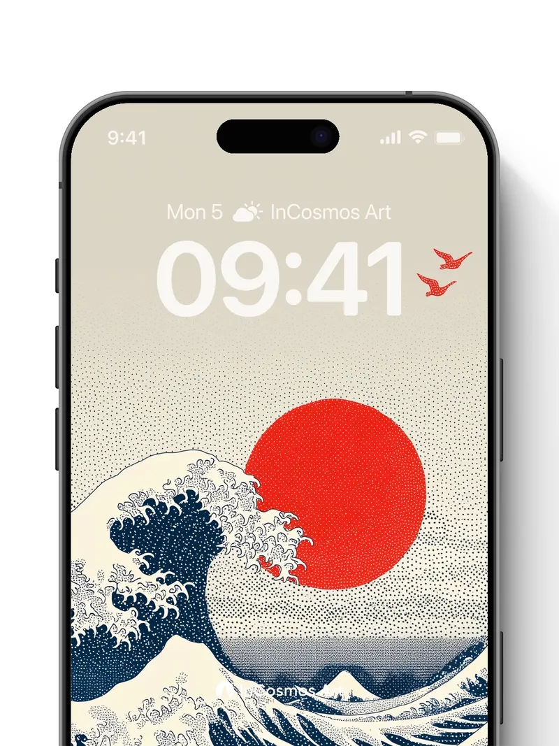 Debug page_description: Did you know Hokusai’s original woodblock print was created using hand-carved blocks and natural pigments? Here, the wave curls like frozen breath, its crest dusted in foam that shivers under a sun so red it feels like molten glass. The sky hums with quiet dots—tiny echoes of ancient printing techniques—while two birds slice through stillness, their wings catching light like tiny paper kites. Share this with your best friend. Send this to your love and swap a matching set. What if every sunrise was painted by the sea?
