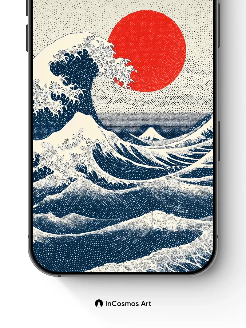 Debug og_description: Did you know Hokusai’s original woodblock print was created using hand-carved blocks and natural pigments? Here, the wave curls like frozen breath, its crest dusted in foam that shivers under a sun so red it feels like molten glass. The sky hums with quiet dots—tiny echoes of ancient printing techniques—while two birds slice through stillness, their wings catching light like tiny paper kites.