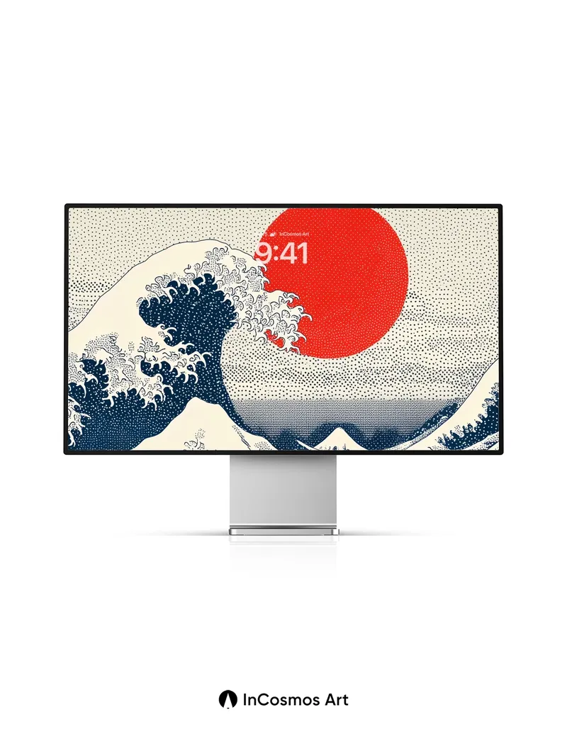 Debug product.metafields.custom.desc: Did you know Hokusai’s original woodblock print was created using hand-carved blocks and natural pigments? Here, the wave curls like frozen breath, its crest dusted in foam that shivers under a sun so red it feels like molten glass. The sky hums with quiet dots—tiny echoes of ancient printing techniques—while two birds slice through stillness, their wings catching light like tiny paper kites.