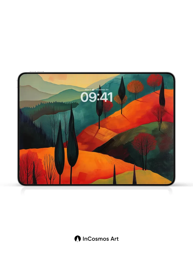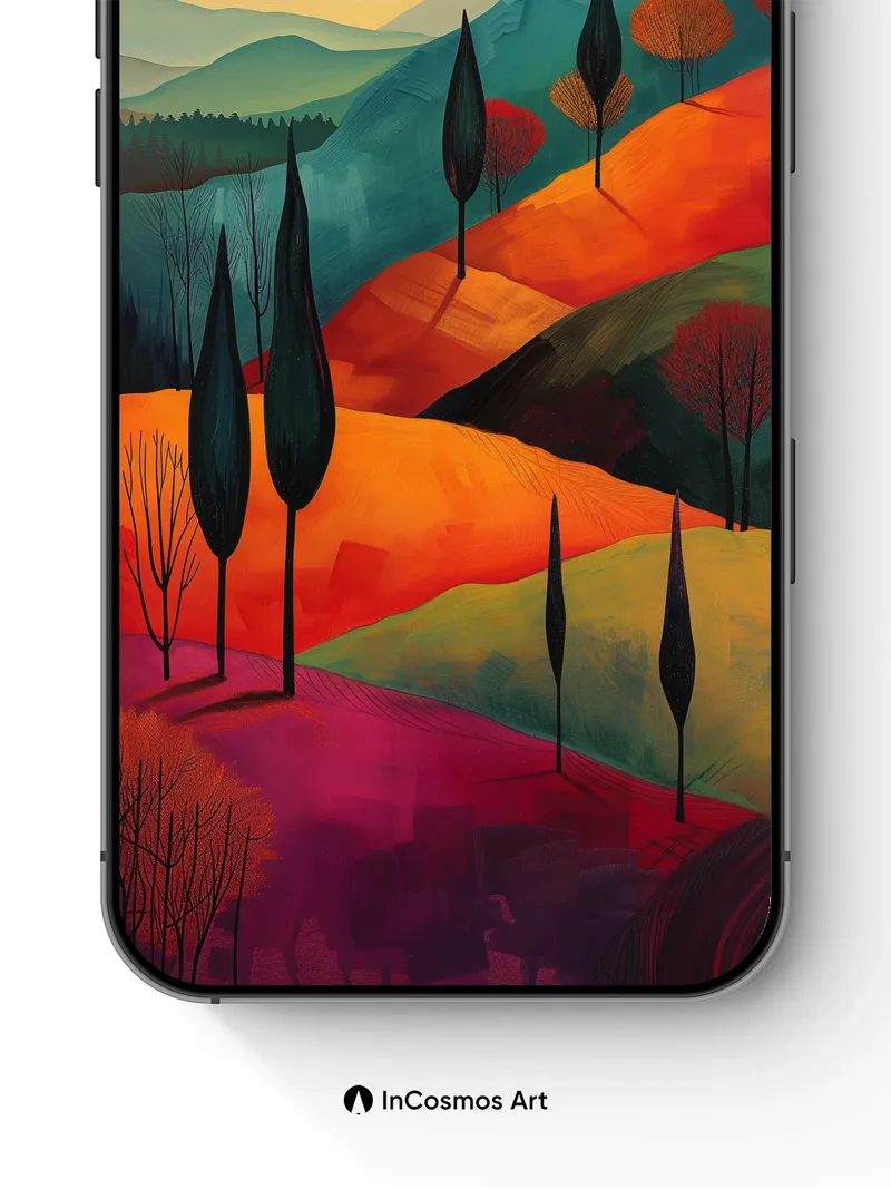 Debug page_description: Did you know that in ancient Persian art, trees were painted to represent the soul’s journey through time? Here, slender cypress silhouettes stand like sentinels on rolling hills drenched in molten amber and violet, while a pale sun hovers above distant mountains like a forgotten memory. The land breathes in warm gradients—each fold of terrain pulsing with color as if lit from within. Share this with your best friend. Send this to your love and swap a matching set. What if the world changed colors every time you blinked?