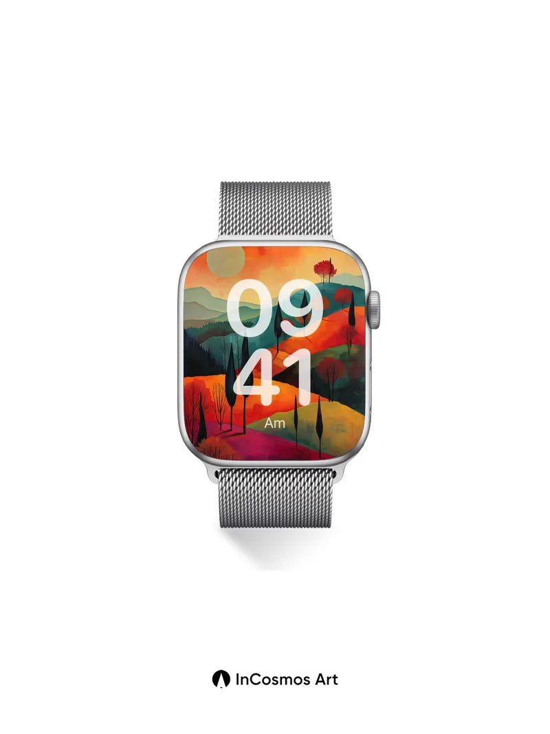 Debug product.metafields.custom.desc: Did you know that in ancient Persian art, trees were painted to represent the soul’s journey through time? Here, slender cypress silhouettes stand like sentinels on rolling hills drenched in molten amber and violet, while a pale sun hovers above distant mountains like a forgotten memory. The land breathes in warm gradients—each fold of terrain pulsing with color as if lit from within.