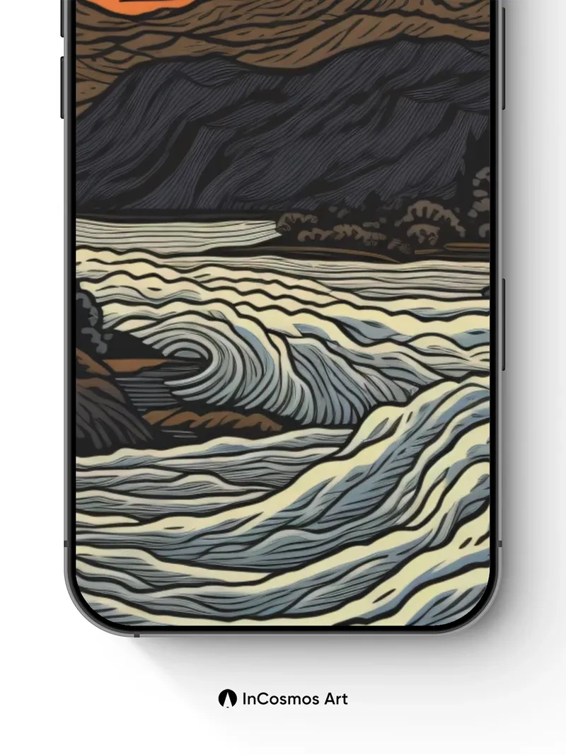 Debug page_description: Did you know the Japanese woodblock artist Hokusai once said, 'I have spent my whole life trying to draw waves'? Here, every curl of water breathes with ancient rhythm, its silver-foam veins pulsing beneath a sky where sun and moon share the same orange flame. The mountains stand like sleeping giants, their ridges etched in inked silence, while the river carves stories into stone—each wave a memory, each shadow a secret. Share this with your best friend. Send this to your love and swap a matching set. What if the ocean remembered every person who ever stood at its edge?