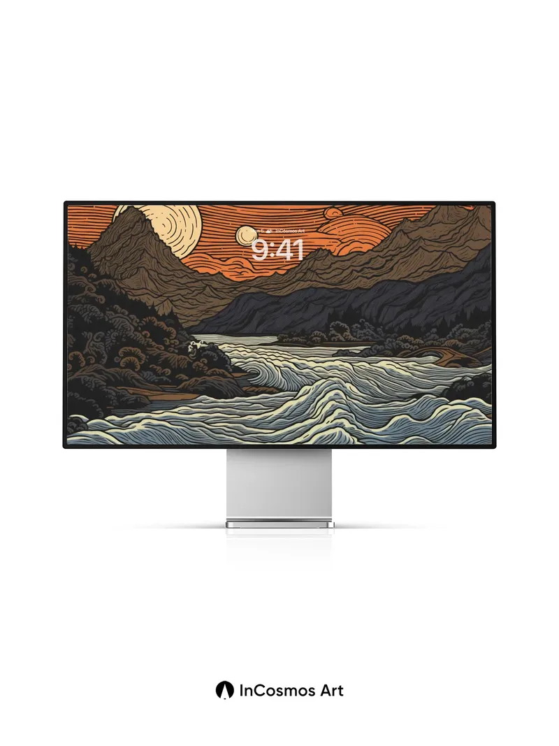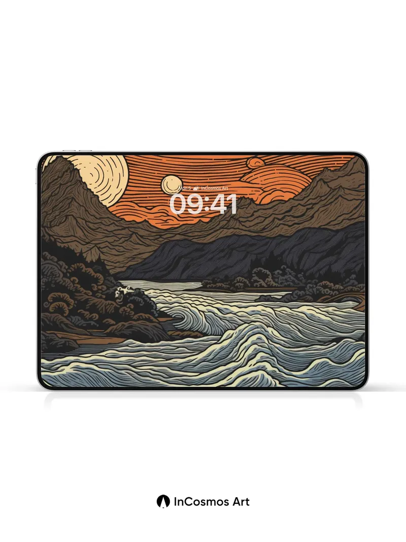 Debug og_description: Did you know the Japanese woodblock artist Hokusai once said, 'I have spent my whole life trying to draw waves'? Here, every curl of water breathes with ancient rhythm, its silver-foam veins pulsing beneath a sky where sun and moon share the same orange flame. The mountains stand like sleeping giants, their ridges etched in inked silence, while the river carves stories into stone—each wave a memory, each shadow a secret.
