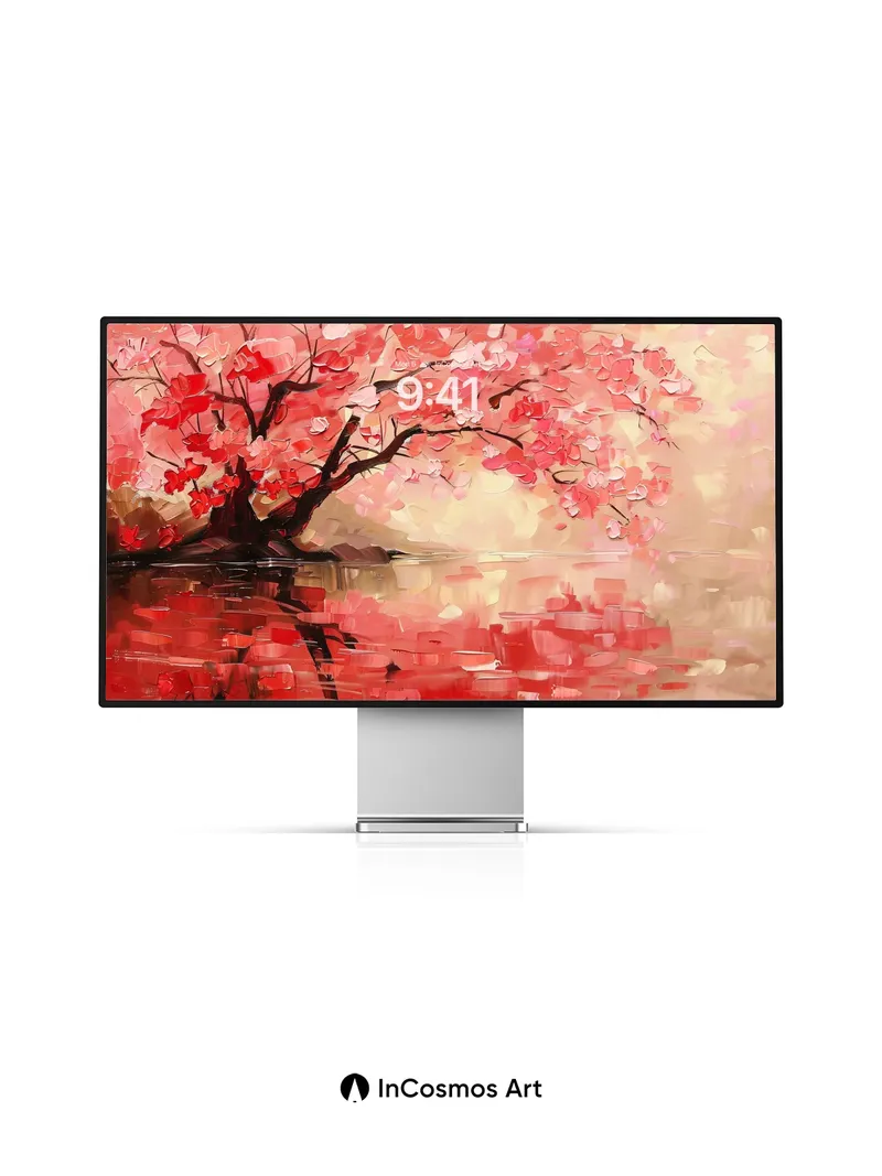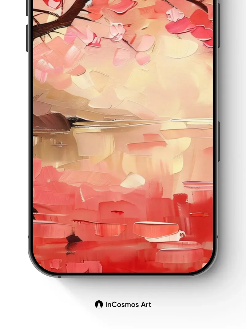 Debug product.metafields.custom.desc: Did you know cherry blossoms in Japan are celebrated not for their longevity, but for their fleeting beauty? This scene captures the moment petals fall like embers into still water, where color breathes through liquid and shadow dances across the surface. The tree’s dark silhouette holds secrets, while its reflection fractures into a mosaic of warmth—each brushstroke a whisper of impermanence.