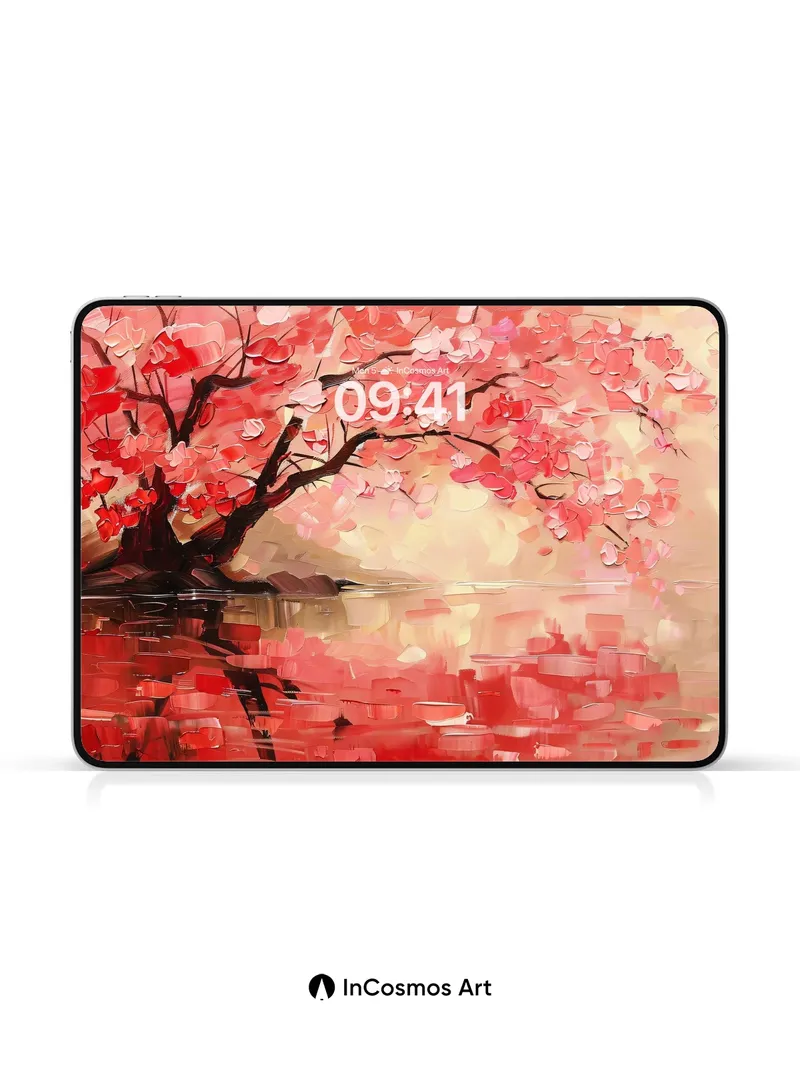 Debug page_description: Did you know cherry blossoms in Japan are celebrated not for their longevity, but for their fleeting beauty? This scene captures the moment petals fall like embers into still water, where color breathes through liquid and shadow dances across the surface. The tree’s dark silhouette holds secrets, while its reflection fractures into a mosaic of warmth—each brushstroke a whisper of impermanence. Share this with your best friend. Send this to your love and swap a matching set. What if every reflection held a memory waiting to be seen?