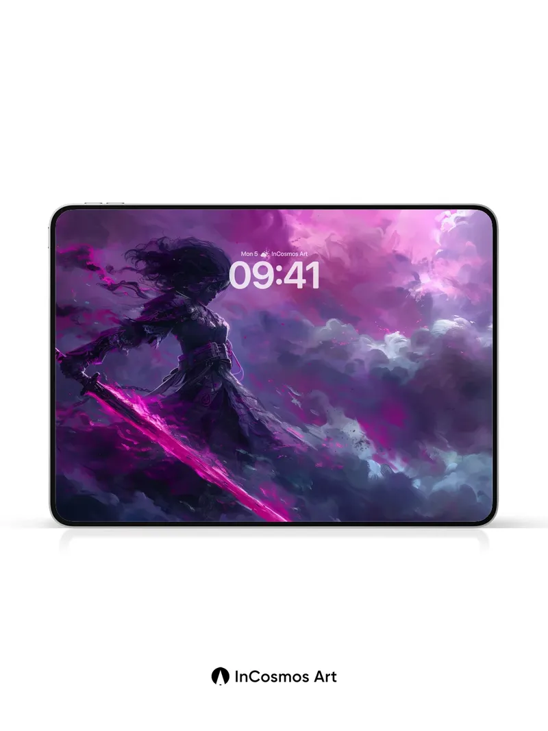 Debug page_description: Did you know the color magenta was first synthesized in 1859 and named after a French town? Here, it pulses like liquid fire along the edge of a sword that cuts through swirling violet clouds, its light crawling over dark fabric like an ancient spell. You stand at the edge of a world where magic is not unseen but felt—cool on your skin, sharp in your breath. Share this with your best friend. Send this to your love and swap a matching set. What if every storm held a weapon waiting to be drawn?