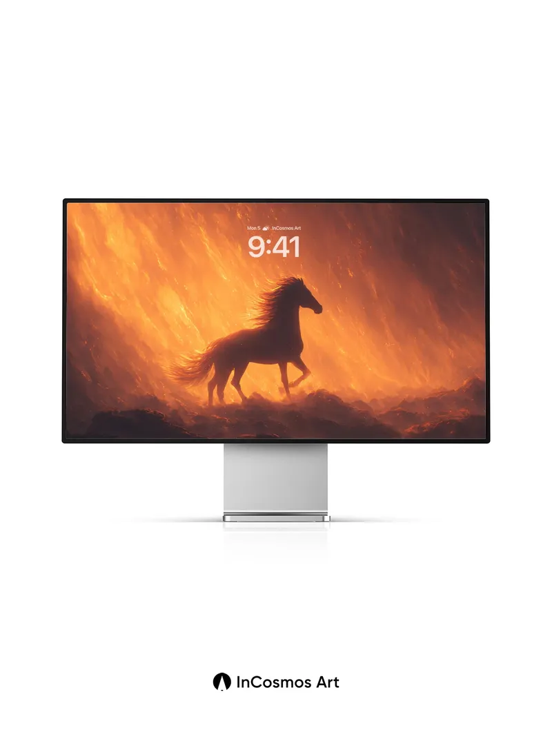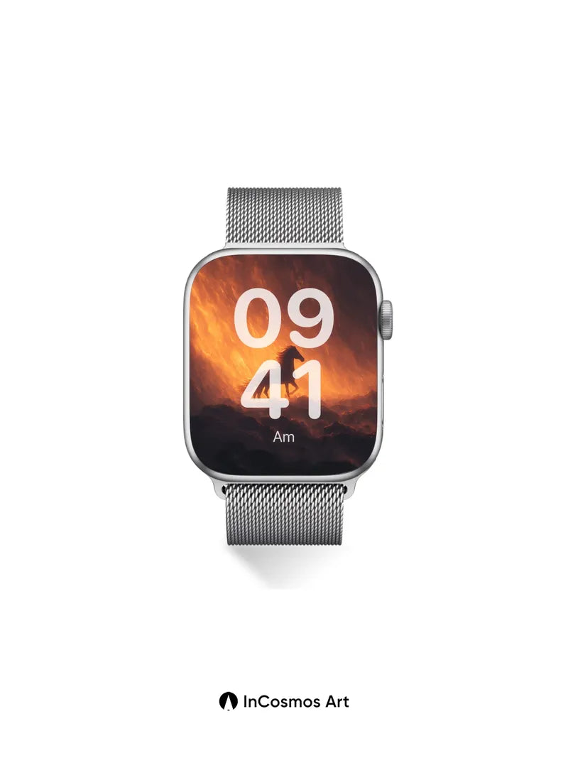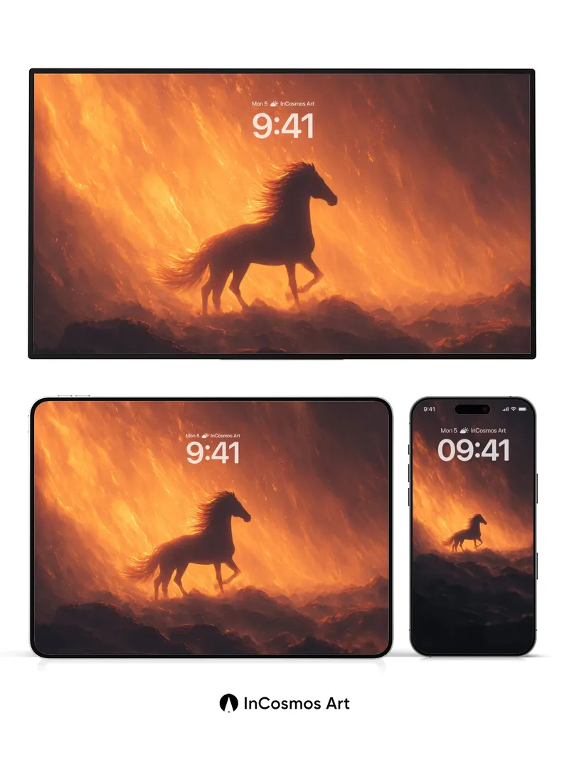 Debug product.metafields.custom.desc: Did you know that firelight can shape shadows into living creatures? A lone horse stands poised atop a sea of molten clouds, its silhouette etched by the fury of an unseen storm. The sky bleeds amber and rust, as if the heavens themselves are burning — yet the stallion moves not in fear, but in quiet defiance, hooves stepping through embers like they’re steps on a sacred path.