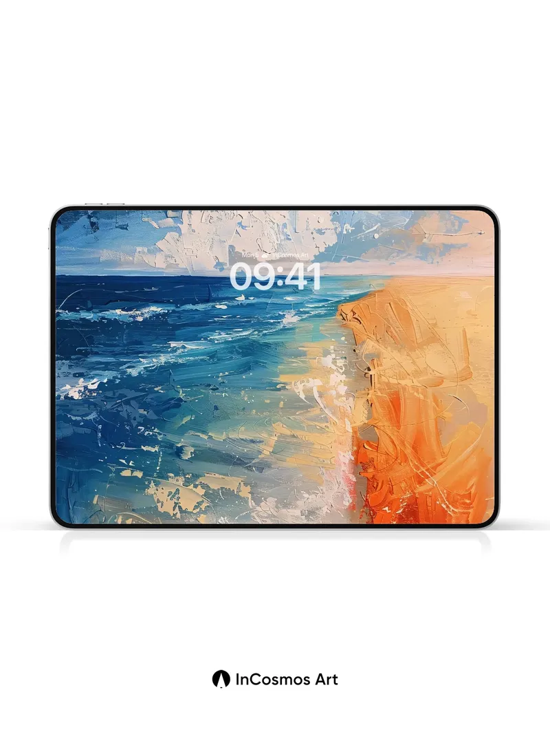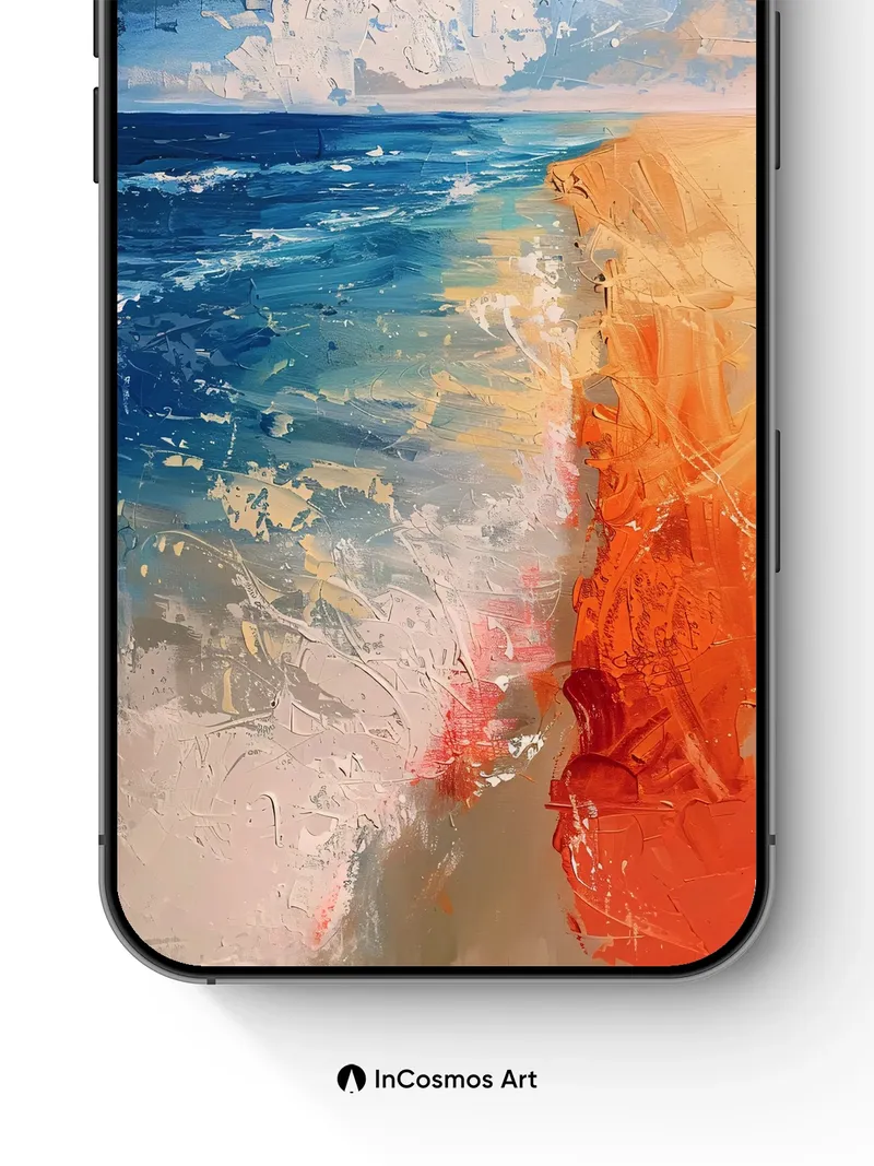 Debug page_description: Did you know the ocean’s edge can breathe like a living canvas? Here, thick impasto strokes of burnt orange and cobalt blue collide where waves kiss sand, each ridge catching light like cracked porcelain under a storm. The sky above fractures into cloud-veiled shards of cerulean and silver, as if painted by a hand that remembers Monet’s brush but dreams in texture. Share this with your best friend. Send this to your love and swap a matching set. What if every sunset left behind a new world on the wall?