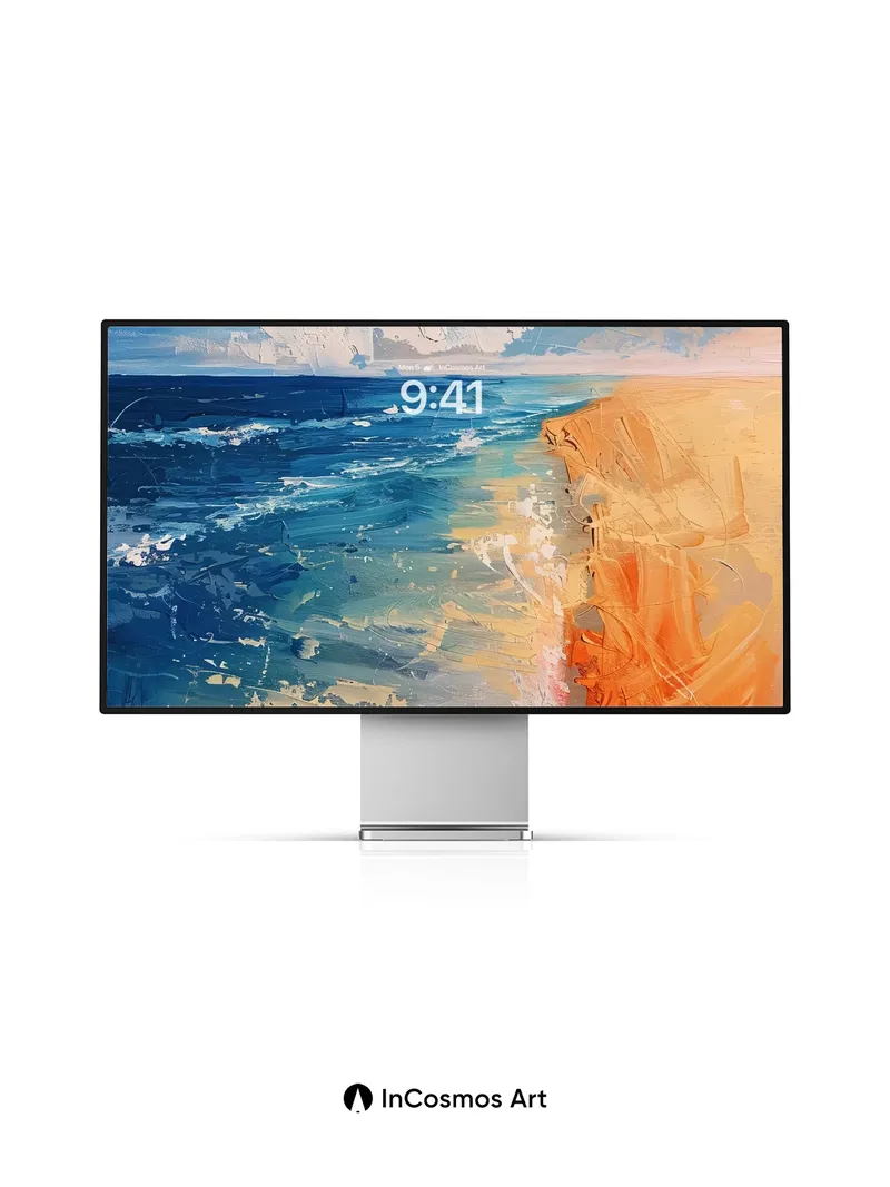 Debug product.metafields.custom.desc: Did you know the ocean’s edge can breathe like a living canvas? Here, thick impasto strokes of burnt orange and cobalt blue collide where waves kiss sand, each ridge catching light like cracked porcelain under a storm. The sky above fractures into cloud-veiled shards of cerulean and silver, as if painted by a hand that remembers Monet’s brush but dreams in texture.