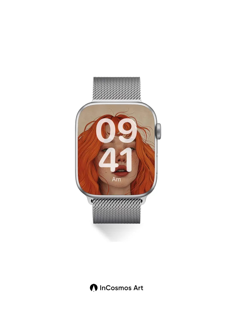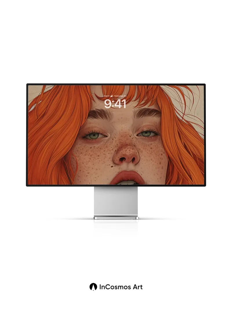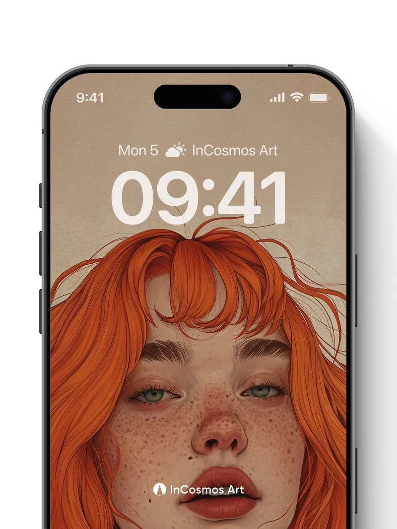 Debug product.metafields.custom.desc: Did you know that freckles are clusters of melanin that bloom like tiny sunspots on skin? Here, they shimmer across porcelain cheeks as fiery red curls cascade like molten thread through soft light. Each strand holds a secret—some curl inward, others leap outward, catching the glow like embers in a quiet room. The eyes, cool and green, anchor the warmth with a stillness that feels both ancient and new.