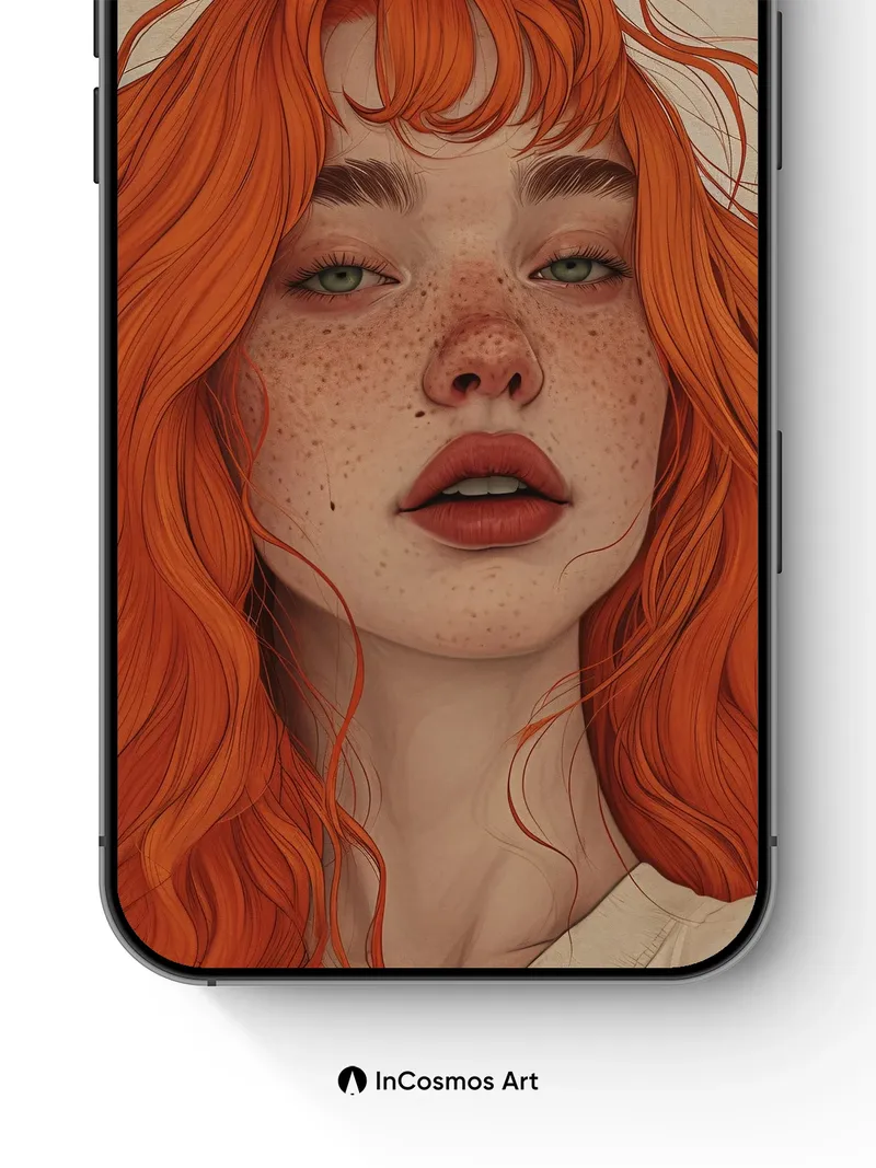 Did you know that freckles are clusters of melanin that bloom like tiny sunspots on skin? Here, they shimmer across porcelain cheeks as fiery red curls cascade like molten thread through soft light. Each strand holds a secret—some curl inward, others leap outward, catching the glow like embers in a quiet room. The eyes, cool and green, anchor the warmth with a stillness that feels both ancient and new.