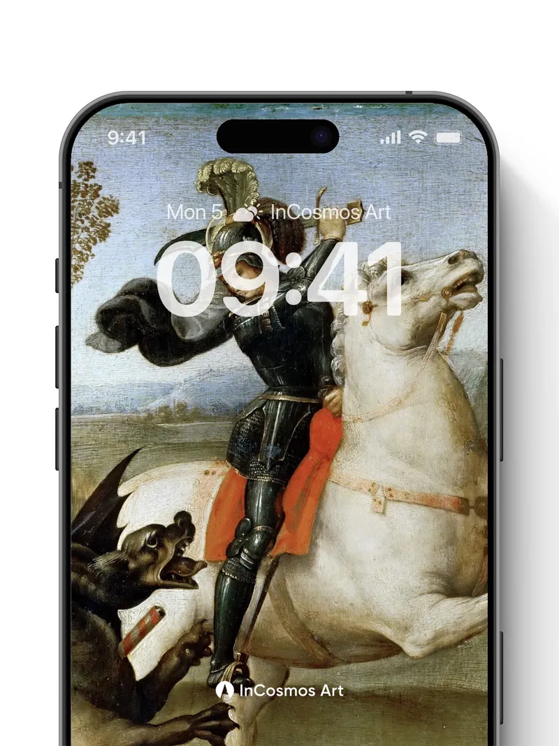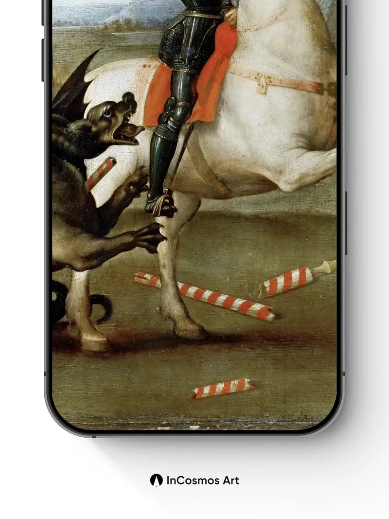 Did you know Renaissance painters often used real metal leaf to make armor gleam like captured sunlight? Here, light crawls over polished steel and flares from the knight’s raised sword, while crimson-and-white striped rockets lie scattered like broken promises on the earth. The horse’s muscles strain in mid-rear, a living sculpture of tension, as shadow clings to the dragon’s scaly hide like ink spilled in oil.