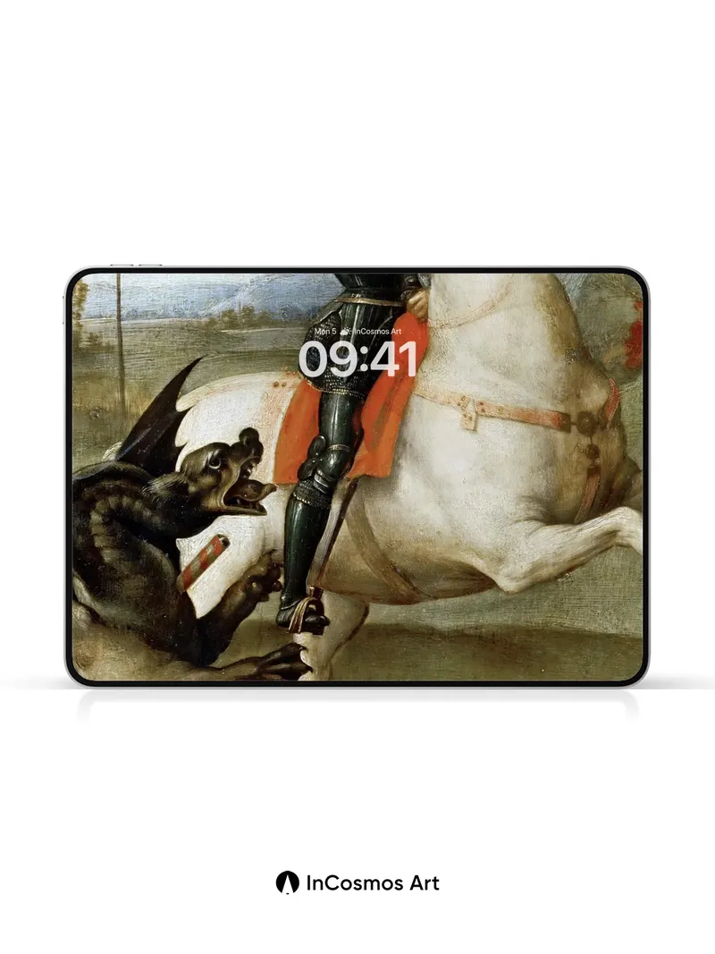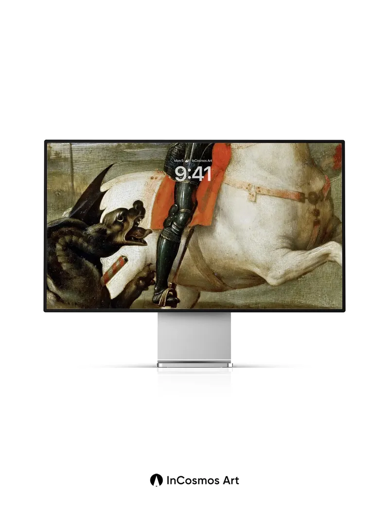 Debug product.metafields.custom.desc: Did you know Renaissance painters often used real metal leaf to make armor gleam like captured sunlight? Here, light crawls over polished steel and flares from the knight’s raised sword, while crimson-and-white striped rockets lie scattered like broken promises on the earth. The horse’s muscles strain in mid-rear, a living sculpture of tension, as shadow clings to the dragon’s scaly hide like ink spilled in oil.