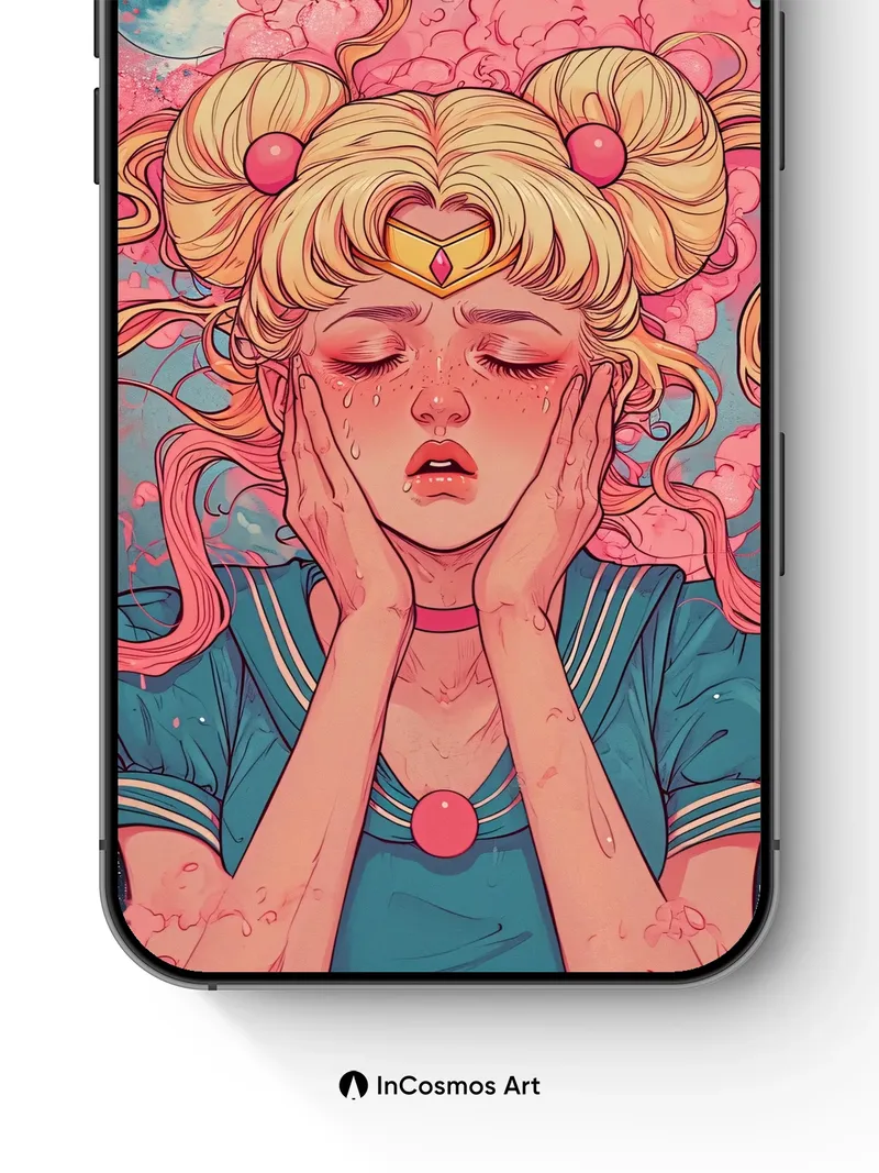 Did you know that the color crimson was once reserved for royal garments in ancient Japan? Here, it bleeds through swirling clouds like liquid memory, framing a golden-haired figure whose tears shimmer under twin moons. Her hands cradle her face as if holding back a universe of sorrow—each droplet catching light like suspended stars. The sky breathes in waves of coral and teal, alive with motion, while her sailor-style collar glows faintly, a quiet anchor in the storm.