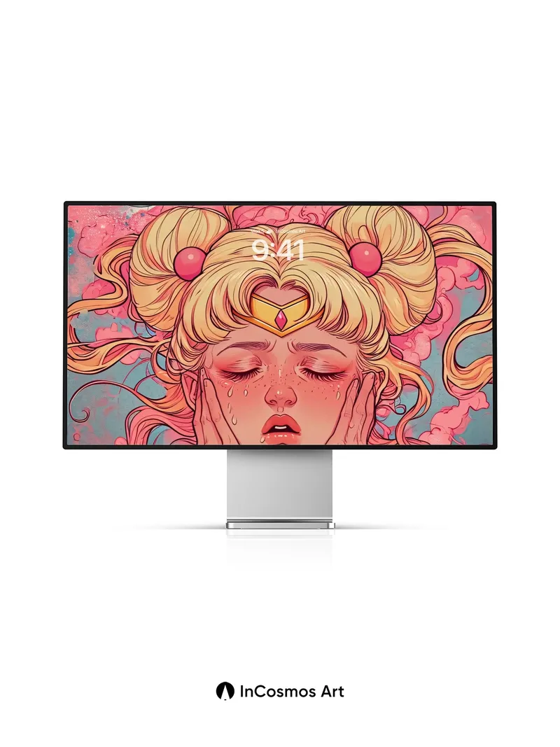 Debug product.metafields.custom.desc: Did you know that the color crimson was once reserved for royal garments in ancient Japan? Here, it bleeds through swirling clouds like liquid memory, framing a golden-haired figure whose tears shimmer under twin moons. Her hands cradle her face as if holding back a universe of sorrow—each droplet catching light like suspended stars. The sky breathes in waves of coral and teal, alive with motion, while her sailor-style collar glows faintly, a quiet anchor in the storm.