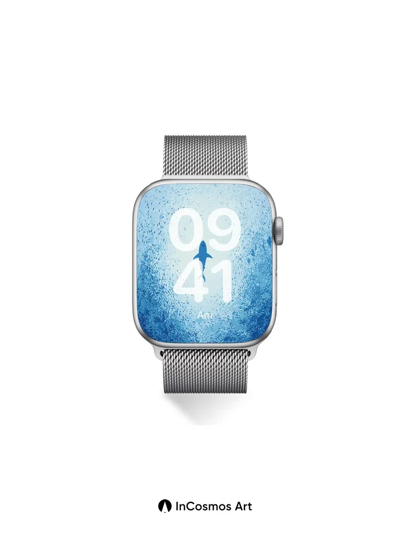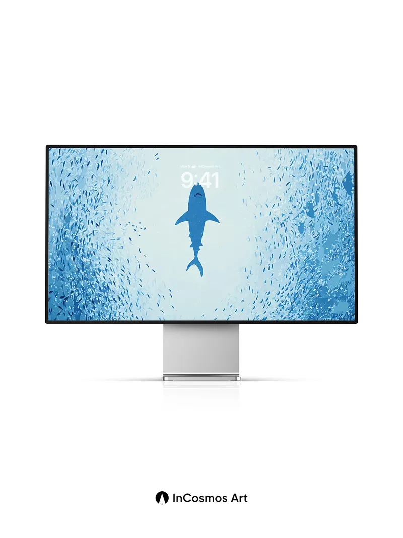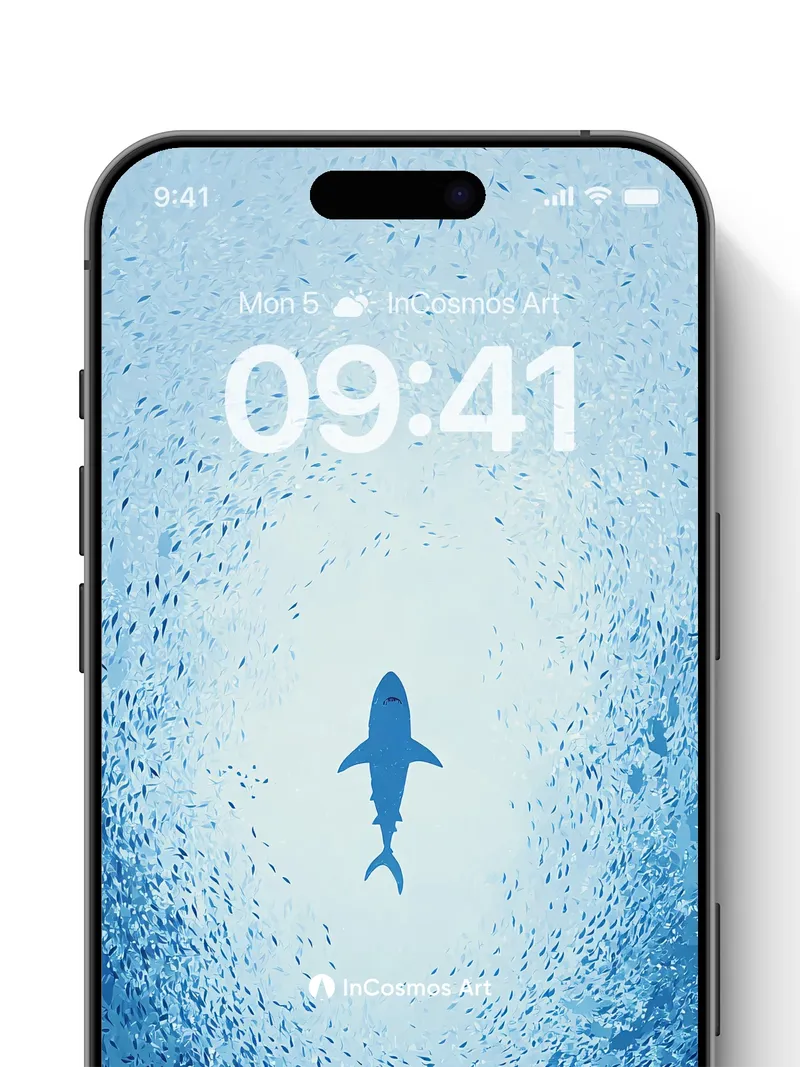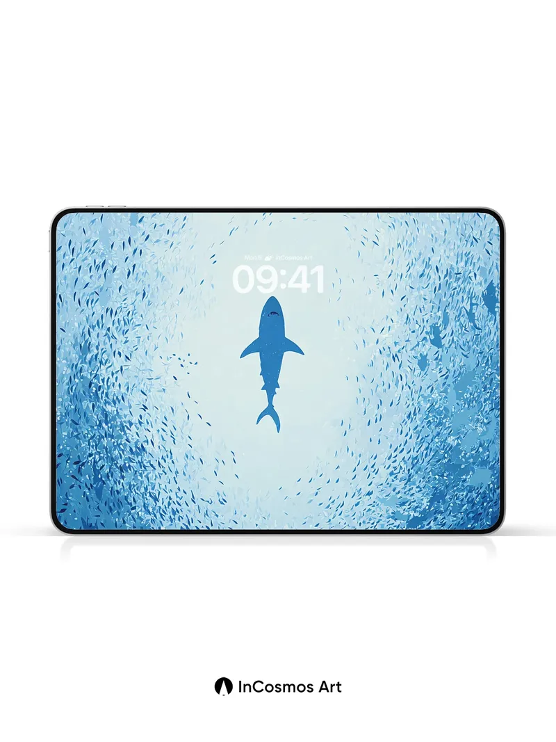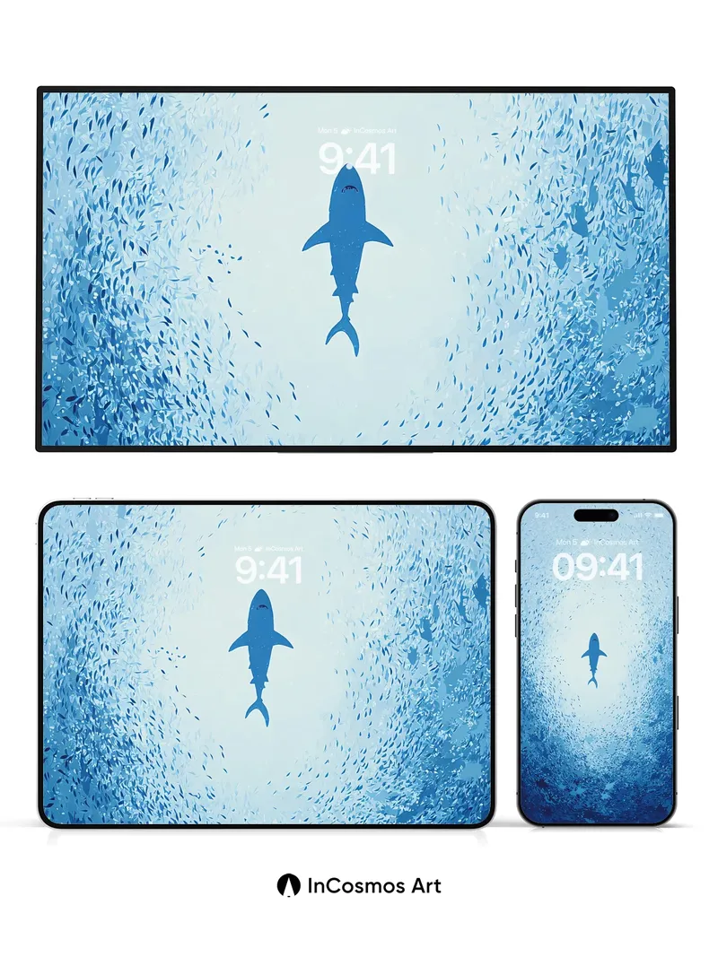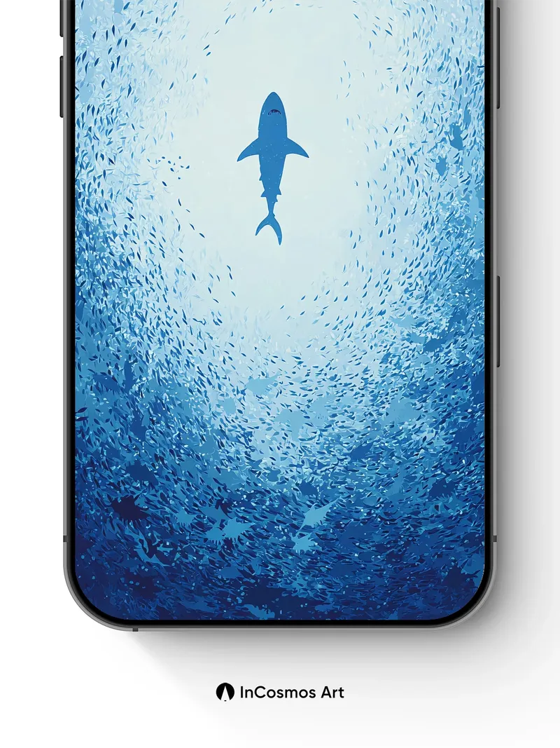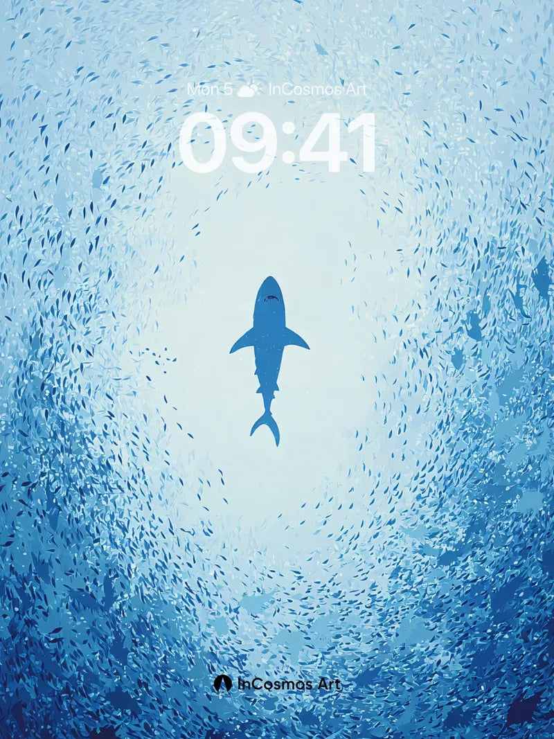 A lone shark glides through a sea of silver fish, its silhouette sharp against the soft blue haze. Did you know sharks have been around for over 400 million years, making them older than dinosaurs? This wallpaper captures the serene yet mysterious presence of these ancient creatures in their natural habitat.