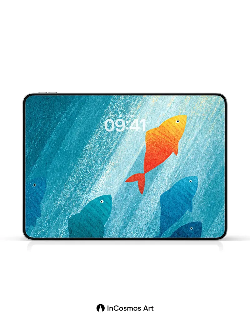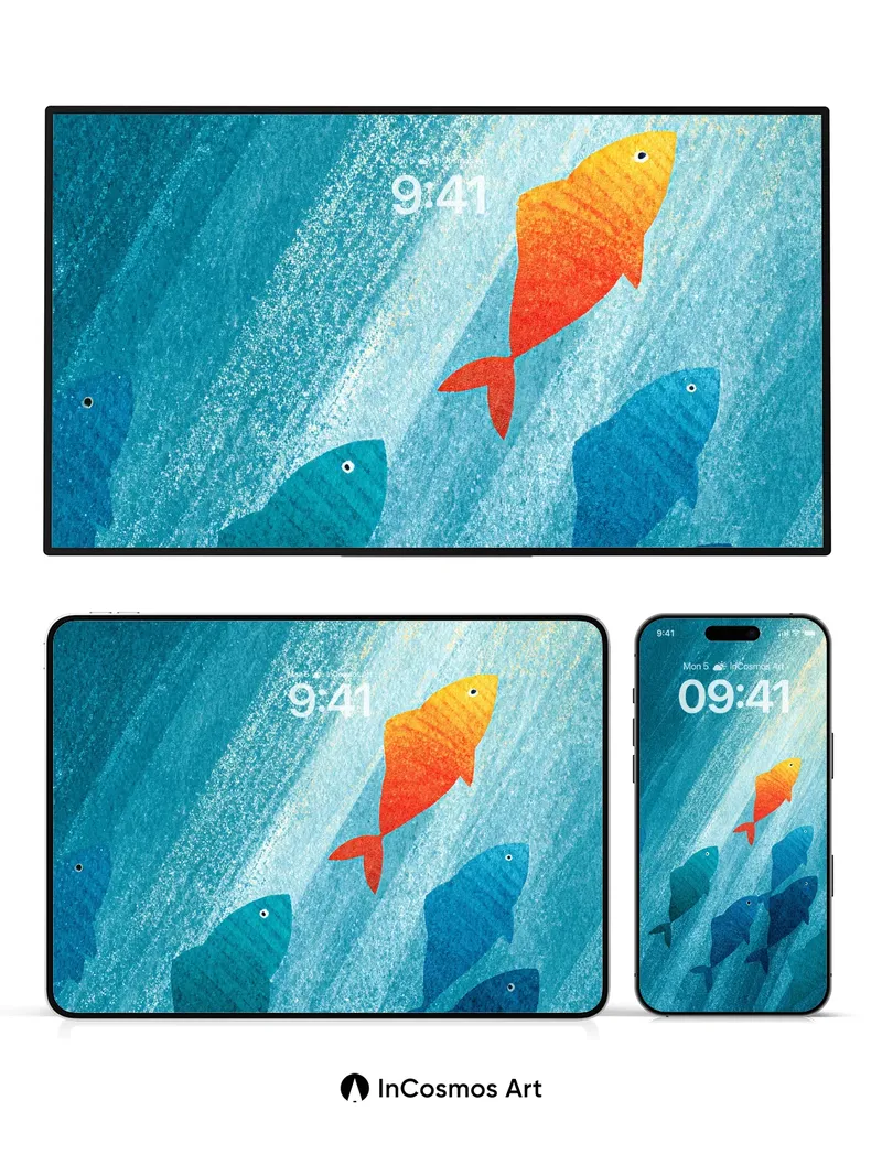 Debug product.metafields.custom.desc: Did you know fish swim in schools not just for safety, but to harness the flow of water like a living current? One bold orange fish breaks rank, slicing through the deep teal waves where light spills like liquid gold. The others follow the tide, their silhouettes etched in shadowed blue—yet this single soul dares to rise, unbound by instinct, chasing a beam no one else sees.