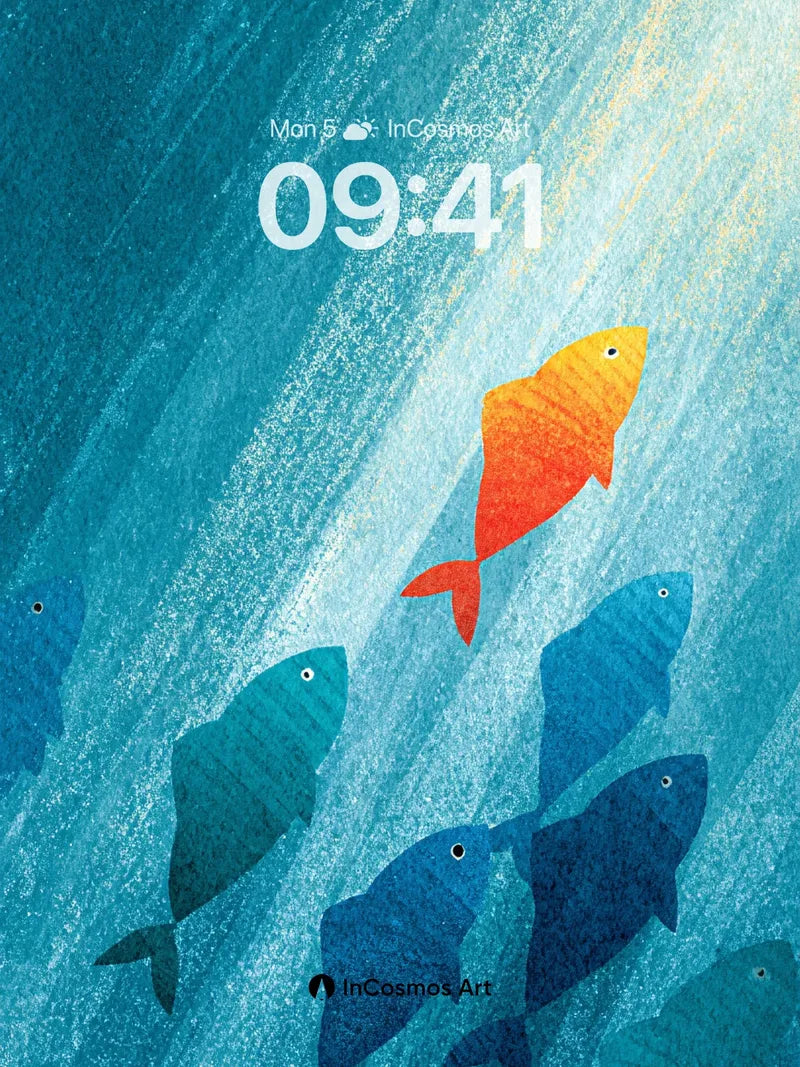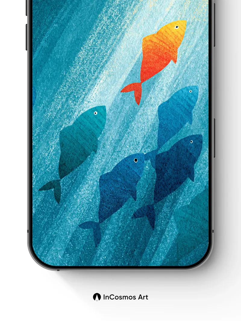 Debug page_description: Did you know fish swim in schools not just for safety, but to harness the flow of water like a living current? One bold orange fish breaks rank, slicing through the deep teal waves where light spills like liquid gold. The others follow the tide, their silhouettes etched in shadowed blue—yet this single soul dares to rise, unbound by instinct, chasing a beam no one else sees. Share this with your best friend. Send this to your love and swap a matching set. What if courage were the only thing that could change the direction of the ocean?