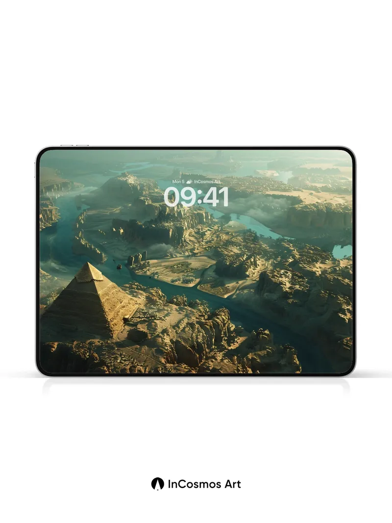 Debug product.metafields.custom.desc: Did you know the Great Pyramids were once coated in polished white limestone, reflecting sunlight like a beacon across the desert? Now, under a hazy golden sky, the pyramid stands silent atop jagged cliffs, its shadow stretching into a winding river that glimmers like liquid obsidian. The wind carries dust in slow spirals, and distant canyons breathe with heat haze—this is not just a landscape, but a memory carved in stone and light.