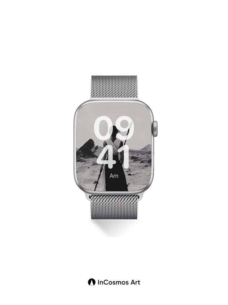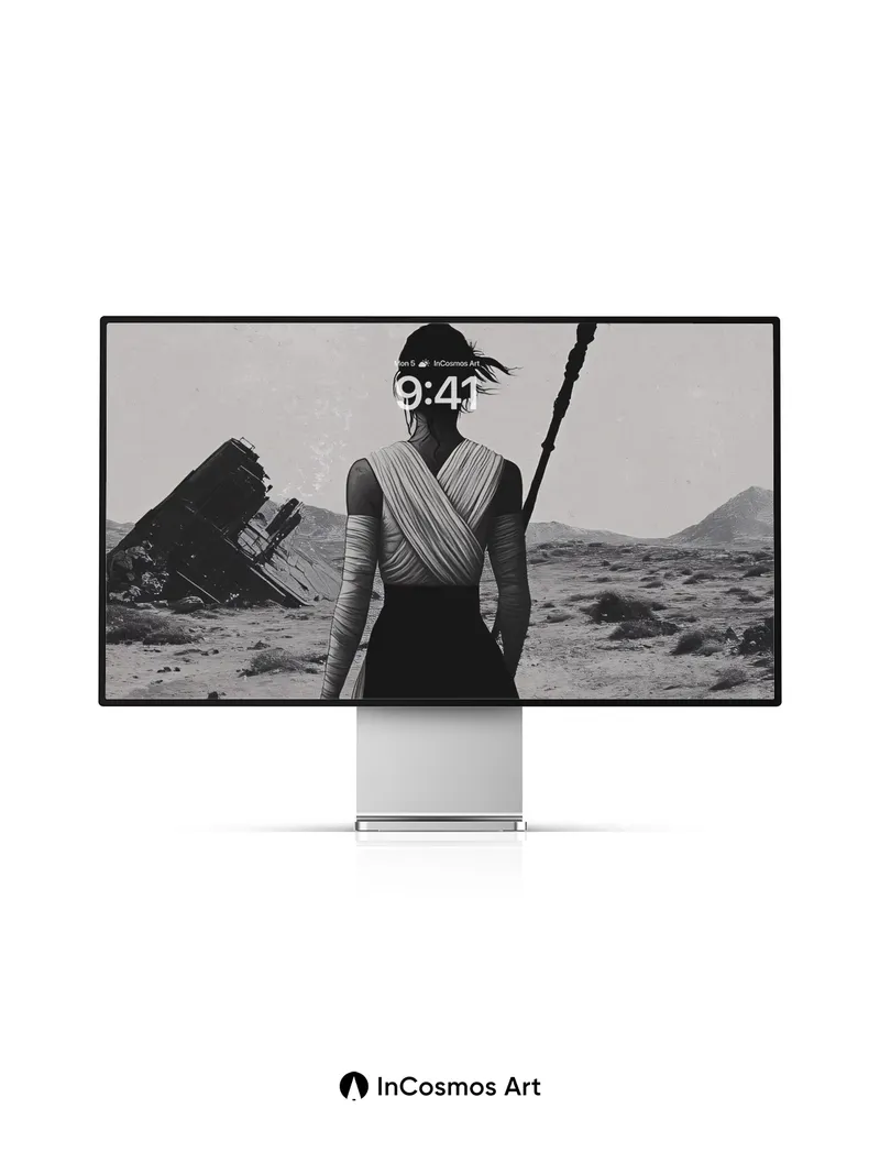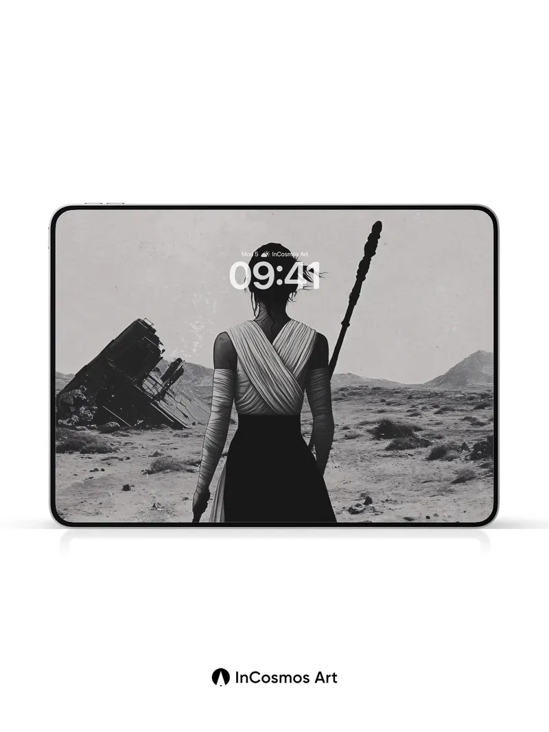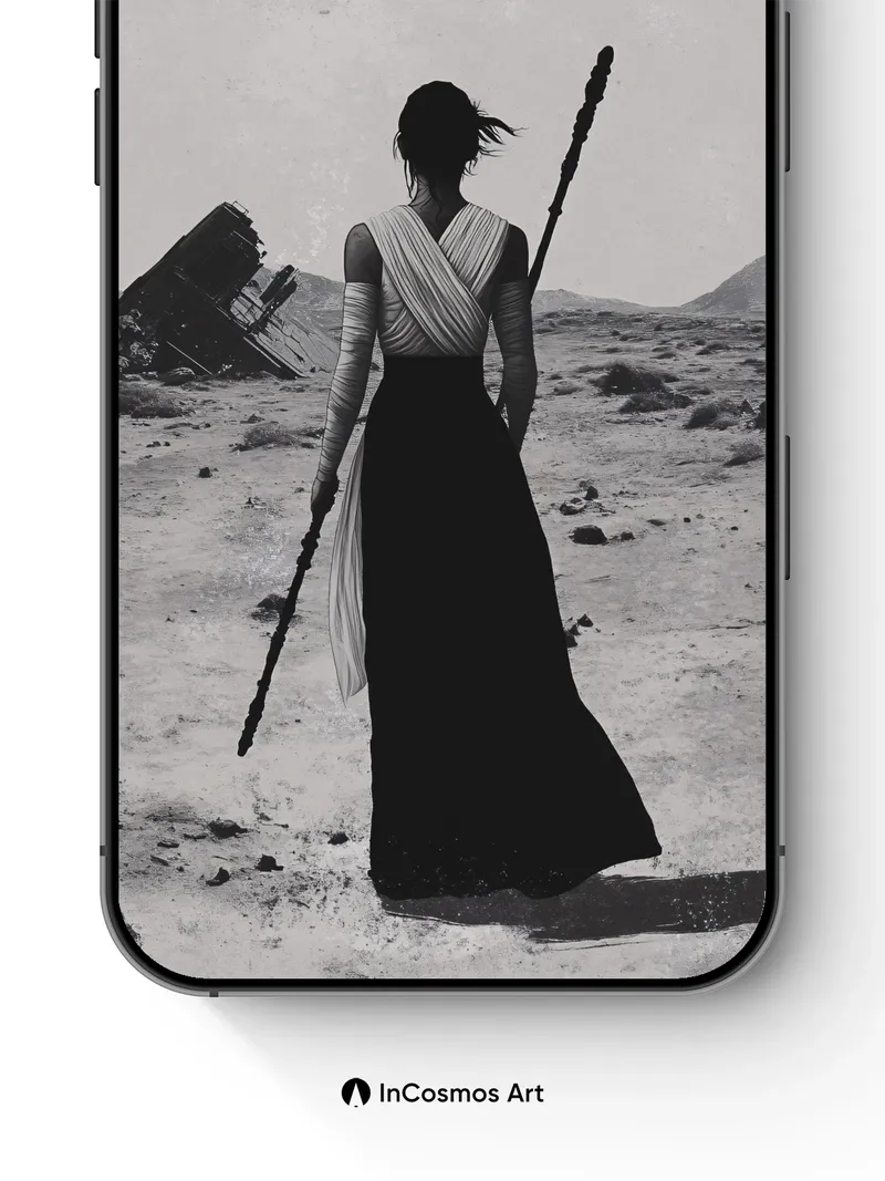Debug product.metafields.custom.desc: Did you know the wind in deserts can carve stone like a sculptor’s hand? Here, it traces the silhouette of a lone figure draped in fabric that breathes with every step, her staff piercing the stillness like a memory. The wreckage behind her hums with silence, its metal ribs bent under time, while distant dunes rise like sleeping giants beneath a sky too vast for words.