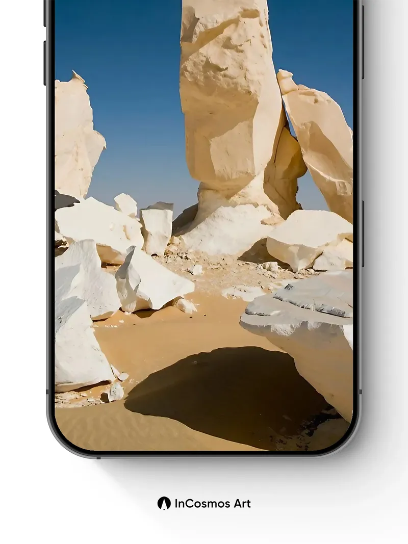 Debug product.metafields.custom.desc: Did you know the White Desert in Egypt is sculpted by wind and time, leaving behind limestone pillars that look like frozen waves? These towering forms stand under a sky so deep it feels like a vault of midnight, their surfaces etched with centuries of erosion—each crevice whispering stories of ancient seas. Light crawls over their curves, turning them into glowing sentinels in a land where silence has weight.