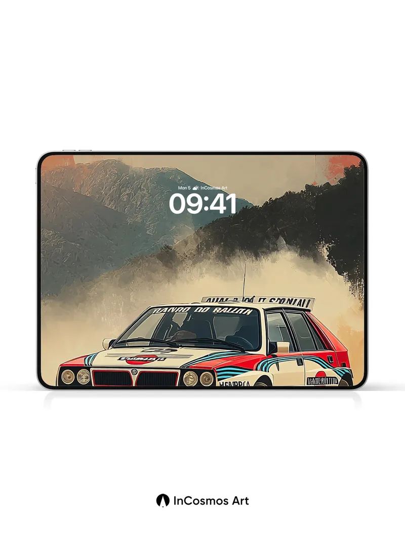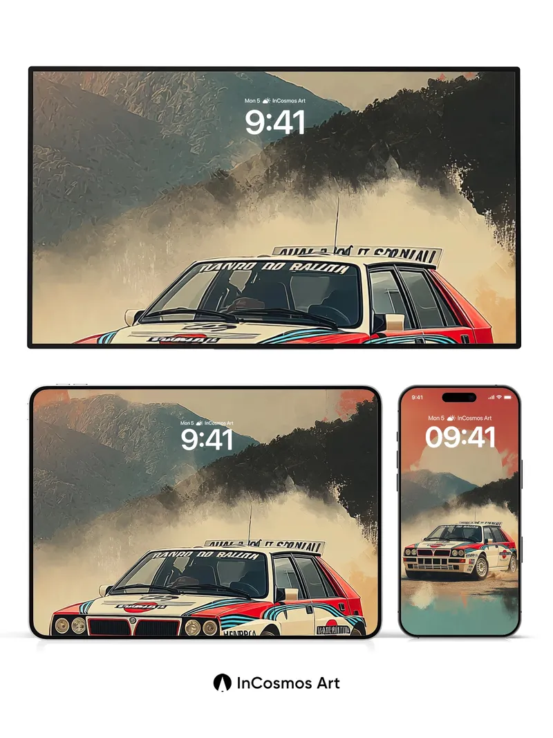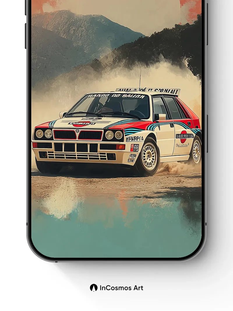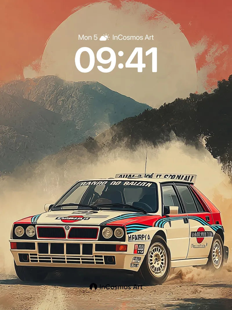Debug page_description: Did you know rally cars once raced through dust storms so thick they blurred the horizon? This image captures that moment—light crawling over the vintage Lancia’s painted skin, kicking up a storm of ochre and ash. The sun hangs low like a molten coin, casting long shadows across the cracked earth, while the reflection in the puddle below breathes life into the scene, mirroring not just the car, but the soul of speed. Share this with your best friend. Send this to your love and swap a matching set. What if every turn of the road left a memory behind?