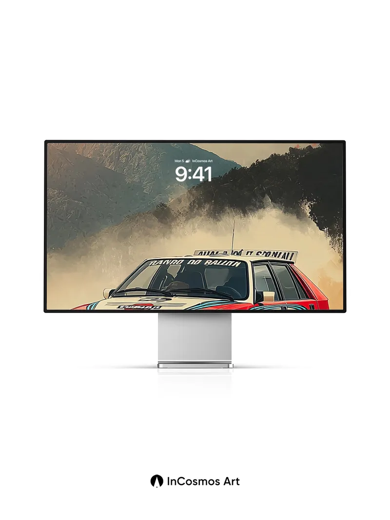 Debug product.metafields.custom.desc: Did you know rally cars once raced through dust storms so thick they blurred the horizon? This image captures that moment—light crawling over the vintage Lancia’s painted skin, kicking up a storm of ochre and ash. The sun hangs low like a molten coin, casting long shadows across the cracked earth, while the reflection in the puddle below breathes life into the scene, mirroring not just the car, but the soul of speed.