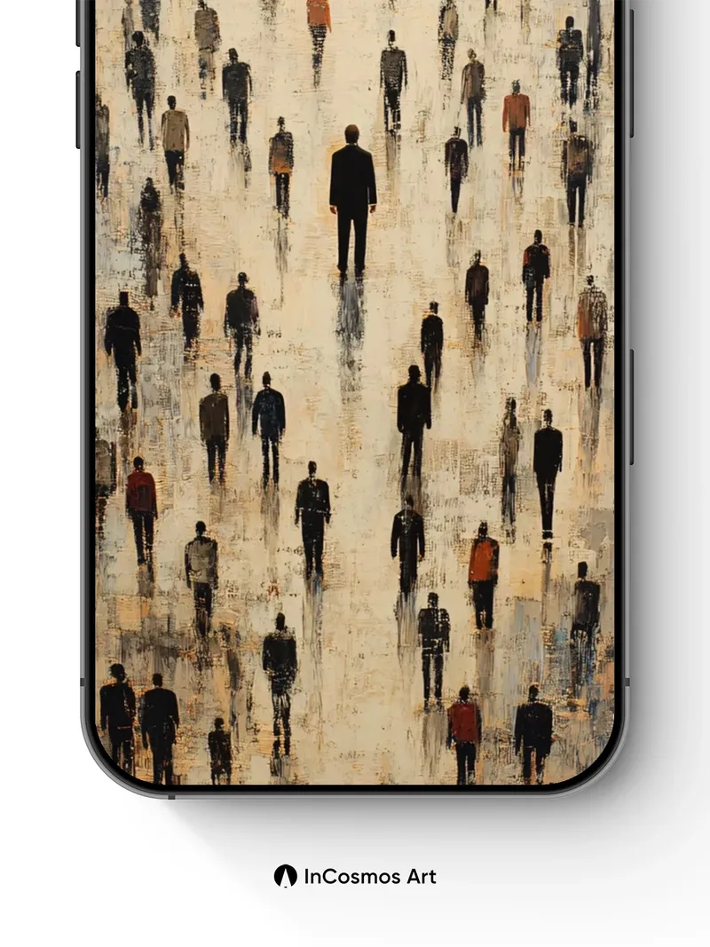 Did you know that in the 19th century, London’s fog was so thick it could obscure entire city blocks? Here, a sea of silhouetted figures drifts across a pale, textured canvas, each one a shadowed echo of solitude amid collective motion. The light breathes faintly through the dust-hued surface, as if memory itself is walking forward—slow, deliberate, and never quite alone.