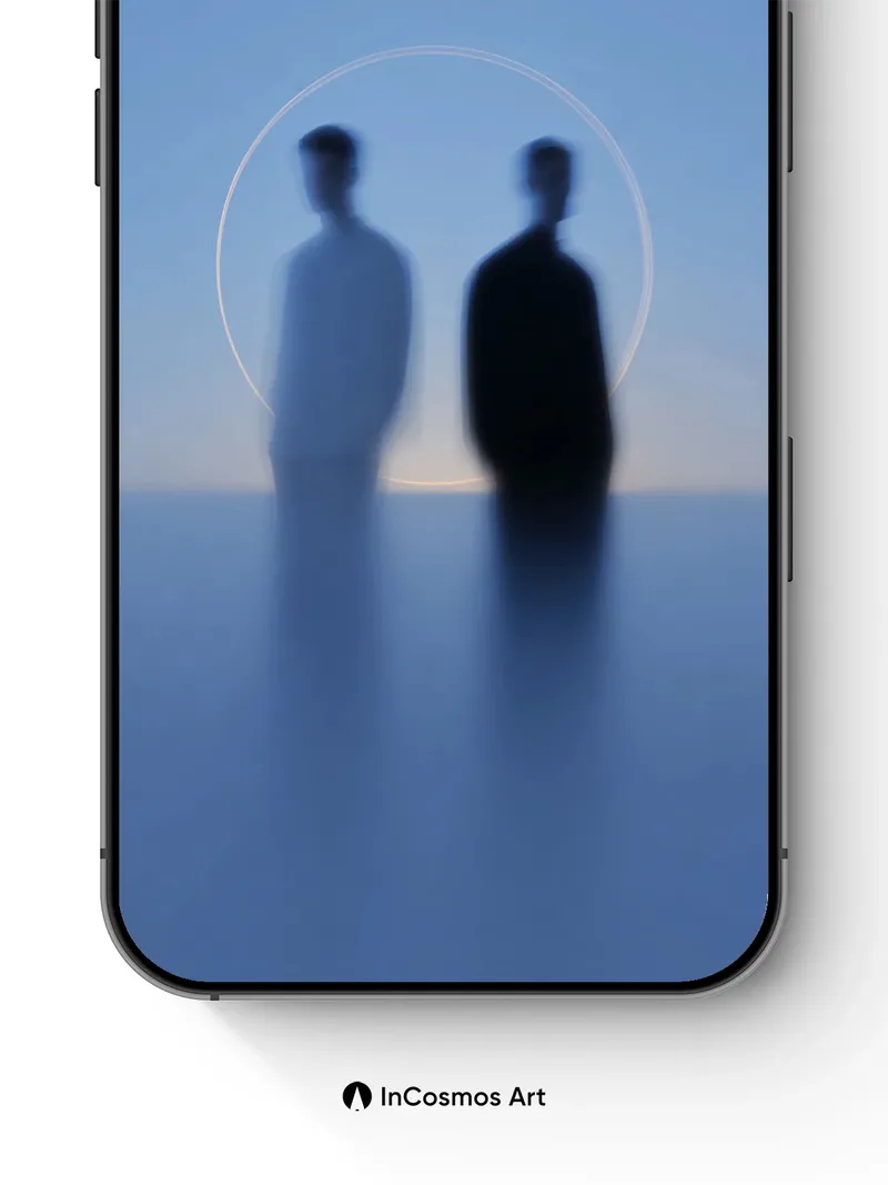 Did you know that the human eye can detect light changes as subtle as one-tenth of a percent? Here, two figures stand suspended in twilight, their forms blurred like memories just out of reach—light breathes through the haze, wrapping them in a ghostly circle. The horizon hums with quiet energy, where absence becomes presence and stillness speaks louder than motion.
