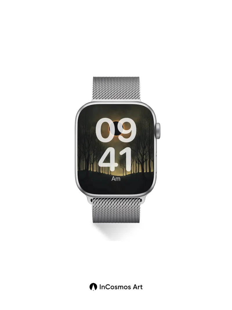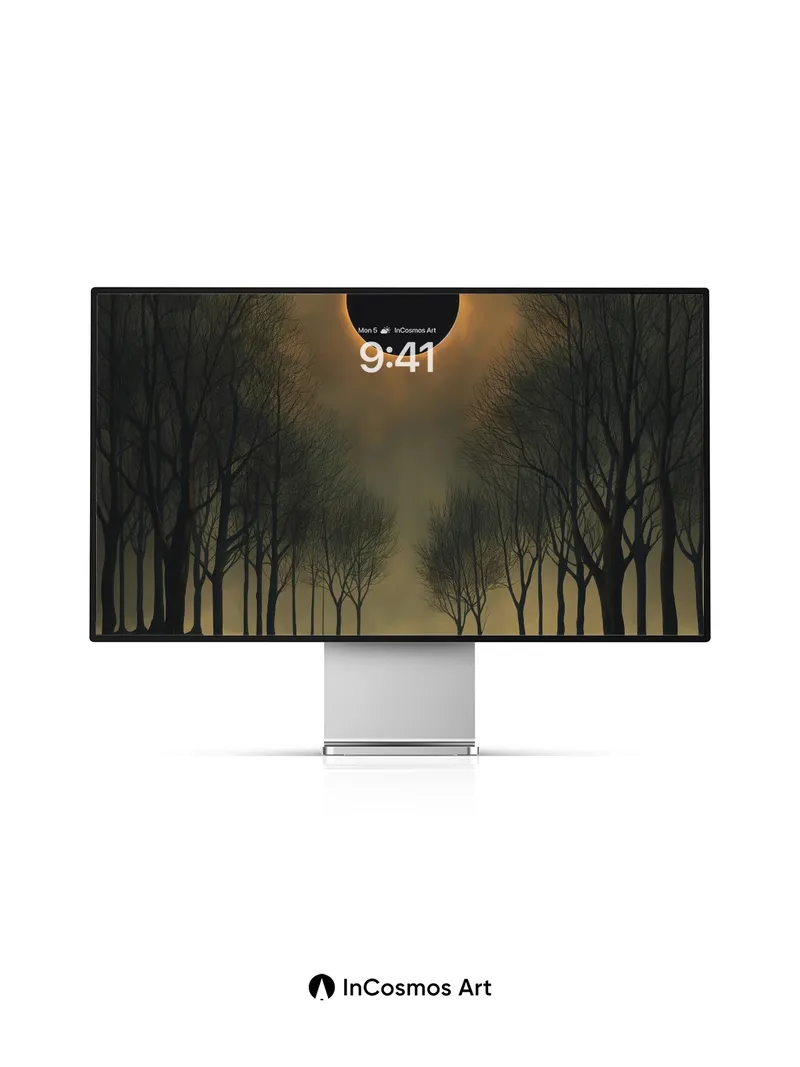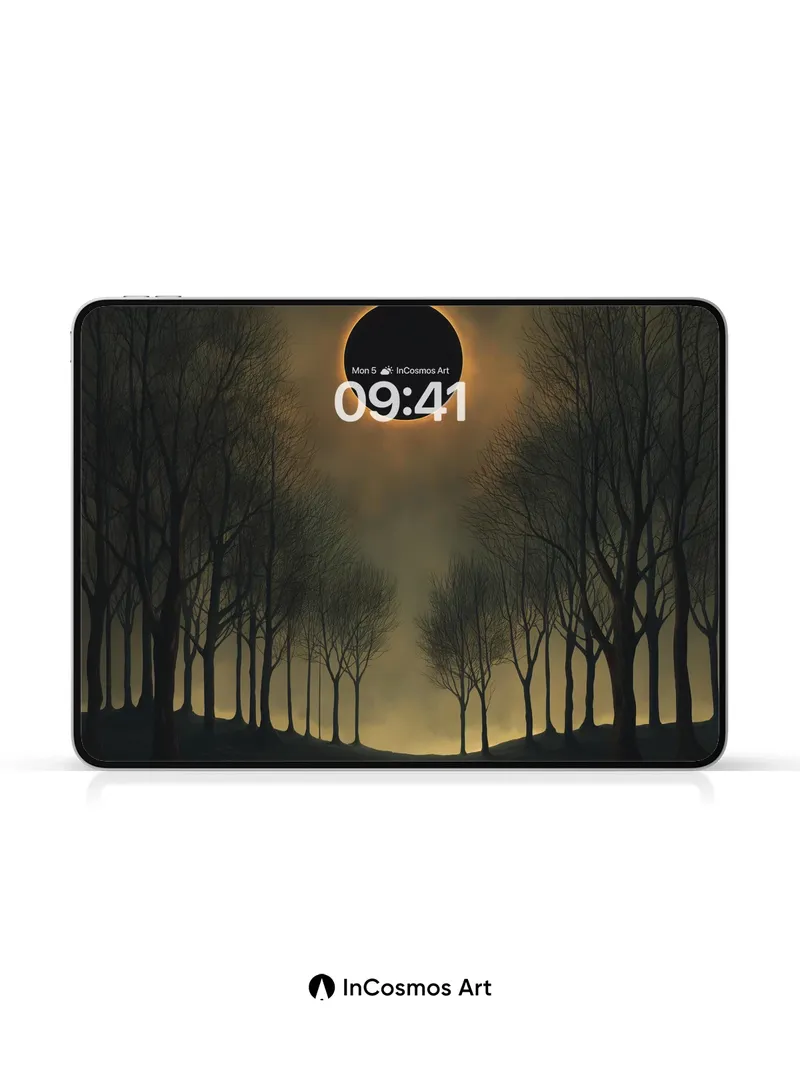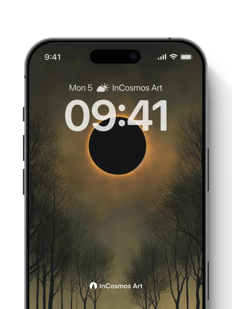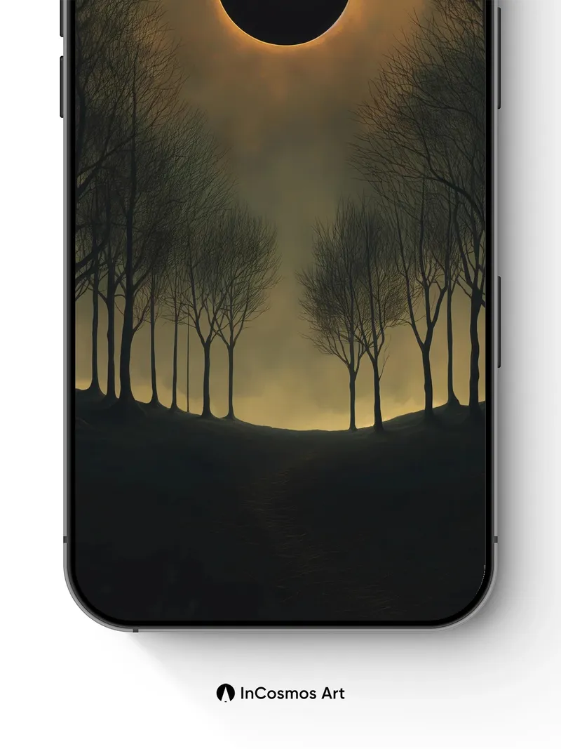 Debug product.metafields.custom.desc: Did you know that during a total solar eclipse, the sun's corona can reveal magnetic loops invisible at other times? Here, the darkened orb hovers like a portal, casting golden light through bare branches that stretch like fingers toward the sky. The air feels still, charged with quiet awe as shadows deepen and the world holds its breath beneath the celestial veil.