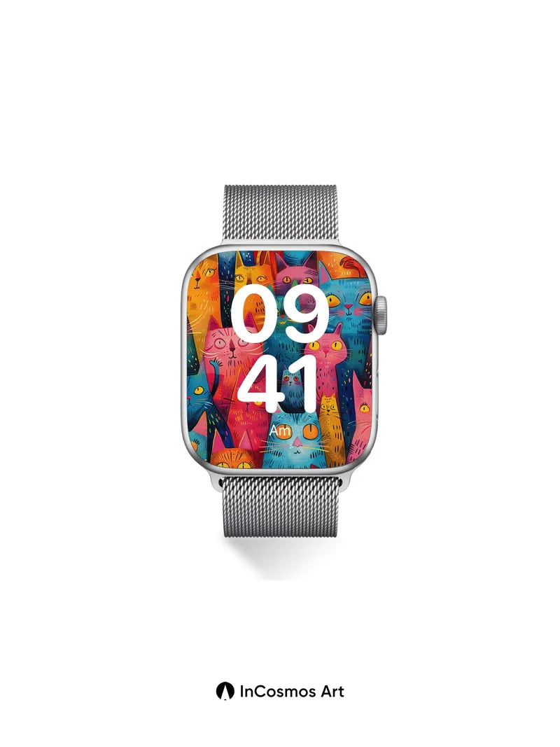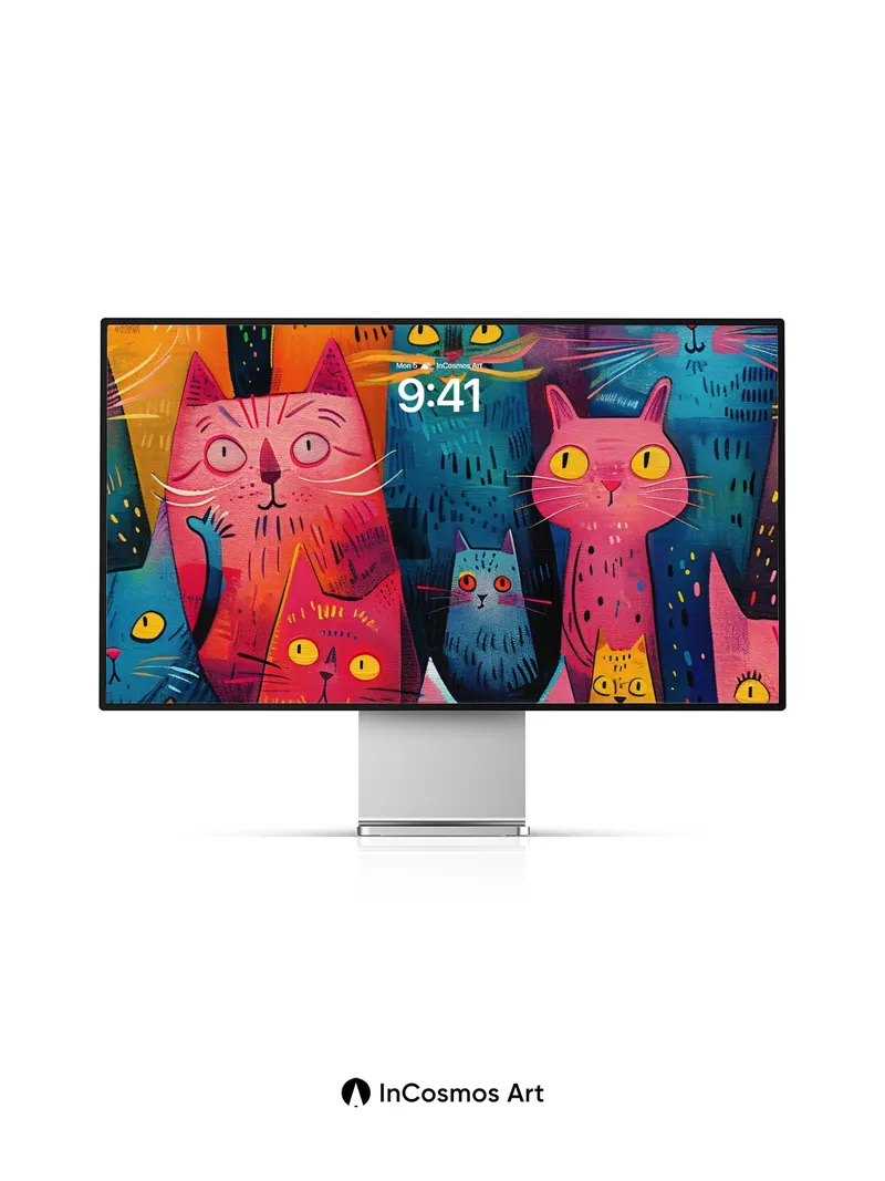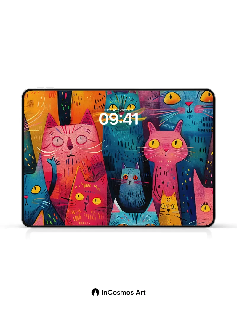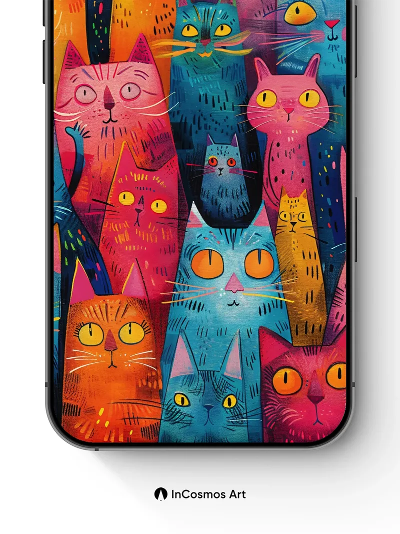 Did you know cats have been depicted in art for over 4,000 years, from ancient Egyptian hieroglyphs to modern surrealism? Here, they rise like living color fields—each face a burst of chromatic energy, their eyes glowing with the pulse of a neon dream. You’re not just seeing cats; you're stepping into a world where fur shimmers like stained glass and whiskers trace electric currents across the wall.