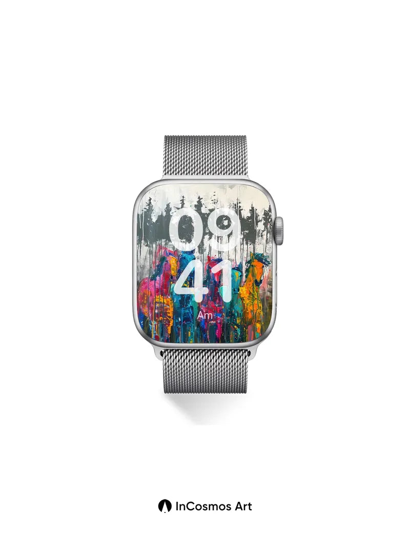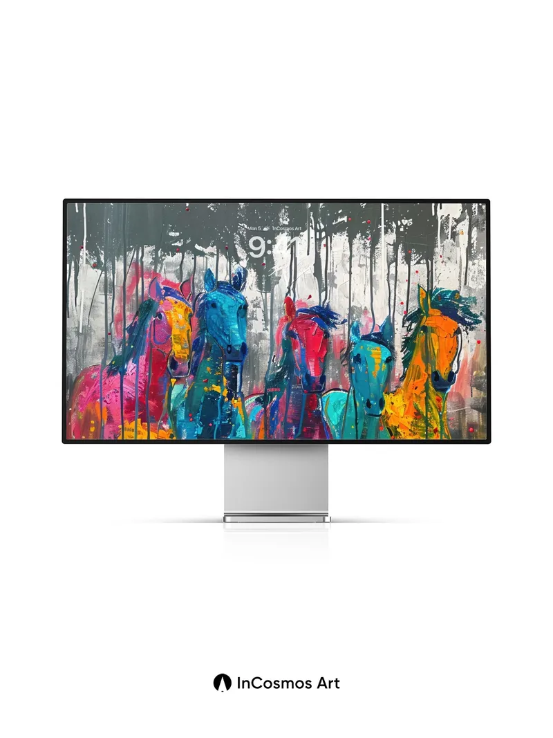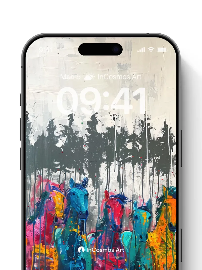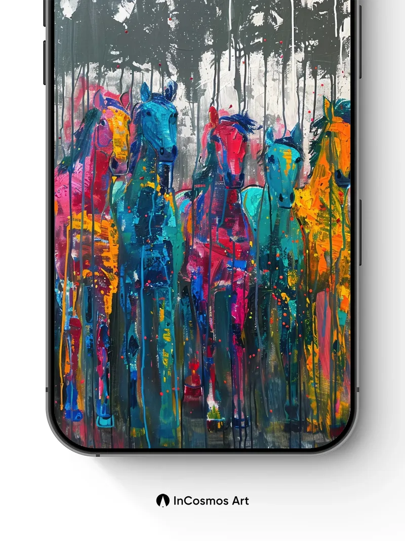 Debug product.metafields.custom.desc: Did you know that horses in ancient art were often painted with symbolic colors to represent spiritual power? Here, vibrant strokes of cobalt, crimson, and neon yellow bleed into one another, forming a herd that seems to gallop through time. The forest behind them is a whisper of charcoal and ash, where light drips like liquid silver—each horse a living myth, breathing color into the wild.