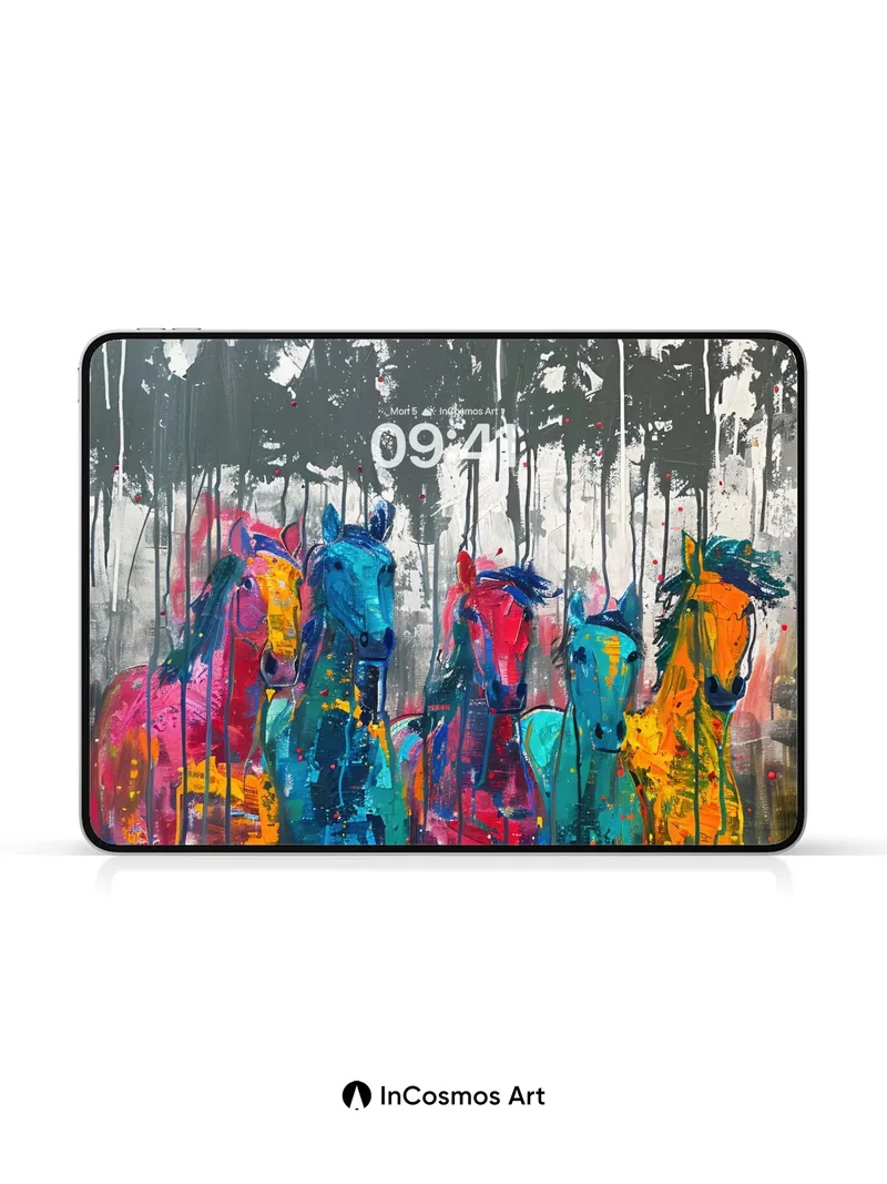Debug page_description: Did you know that horses in ancient art were often painted with symbolic colors to represent spiritual power? Here, vibrant strokes of cobalt, crimson, and neon yellow bleed into one another, forming a herd that seems to gallop through time. The forest behind them is a whisper of charcoal and ash, where light drips like liquid silver—each horse a living myth, breathing color into the wild. Share this with your best friend. Send this to your love and swap a matching set. What if your walls could remember the sound of hooves on rain-slicked earth?