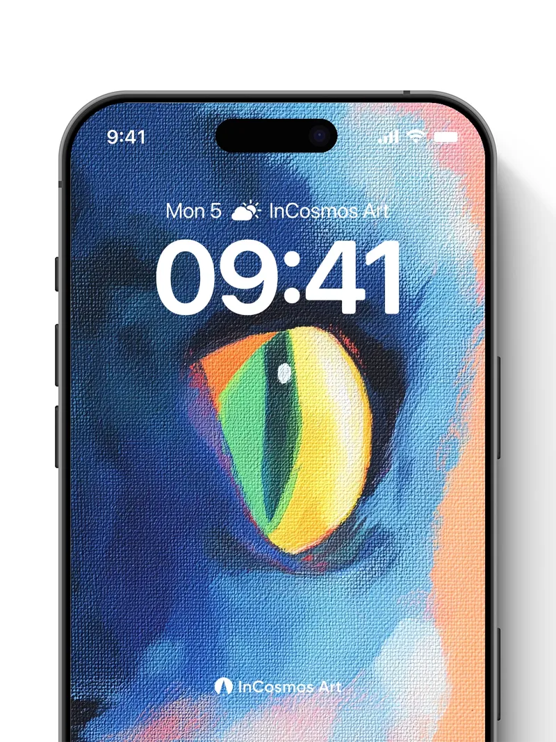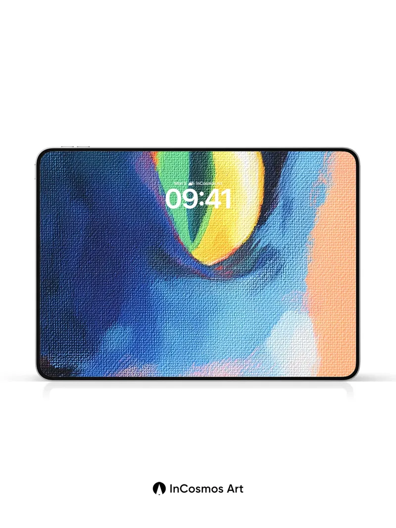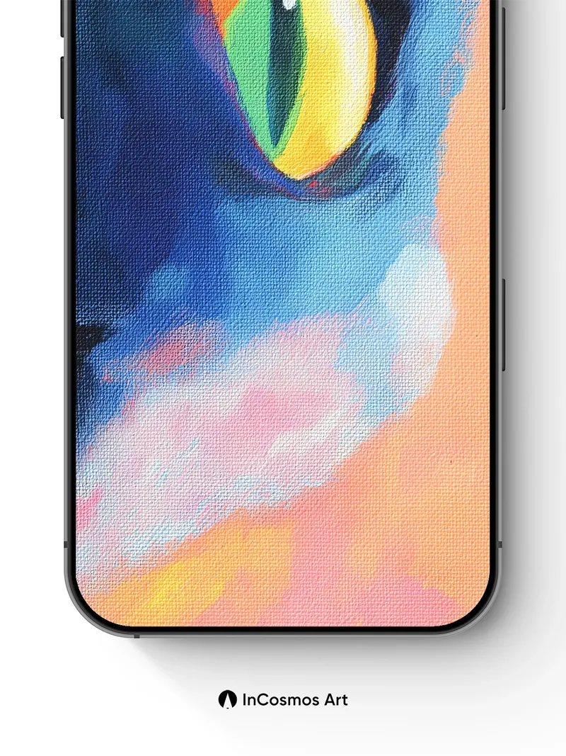 Debug product.metafields.custom.desc: Did you know the iris of a cat can reflect up to 100 times more light than human eyes, creating an almost supernatural glow in low light? This vivid eye seems to pulse with inner energy, its yellow and green hues shifting like liquid sunlight trapped beneath glass. The surrounding blues and pinks bleed into one another like watercolor on wet paper, making the gaze feel both ancient and alive.