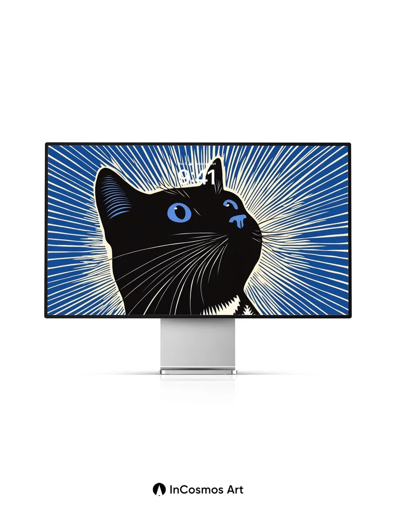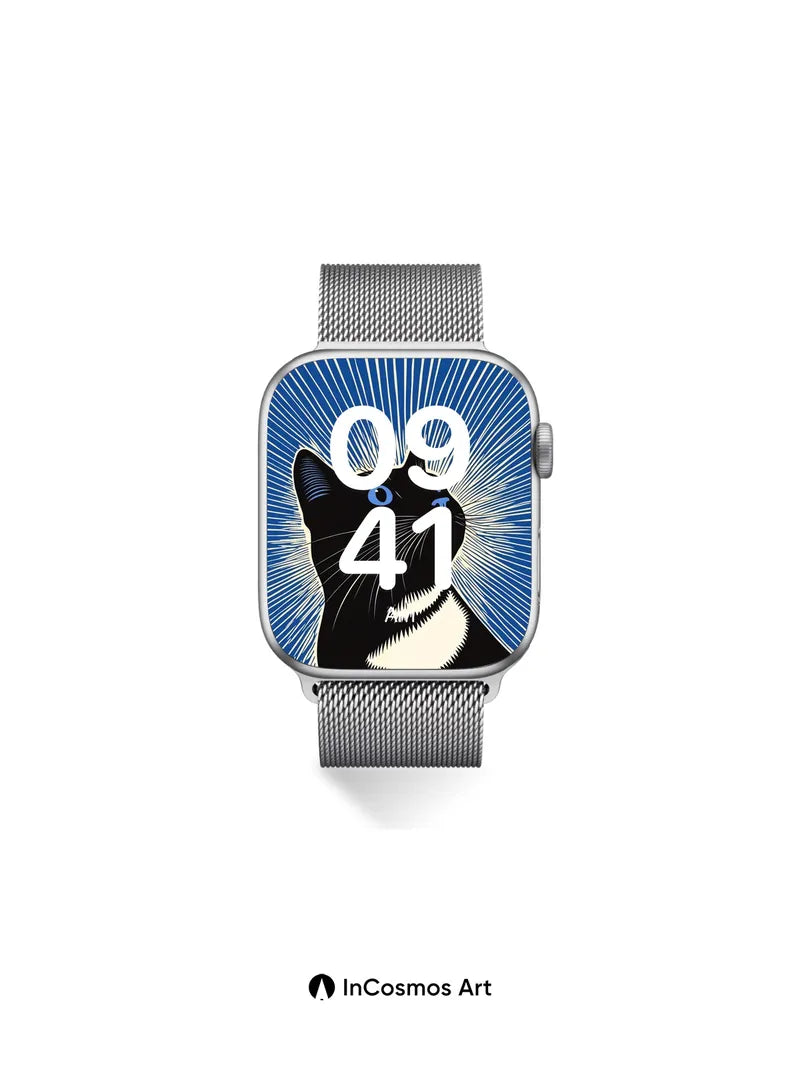 Debug product.metafields.custom.desc: Did you know cats can see ultraviolet light, making their world shimmer with unseen patterns? This bold feline silhouette glows against a kaleidoscope of electric blue rays that pulse like static in the dark, each line a whisper of energy tracing the edges of perception. The stark contrast between midnight fur and luminous streaks evokes a moment frozen in cosmic surprise—where curiosity meets the unknown.