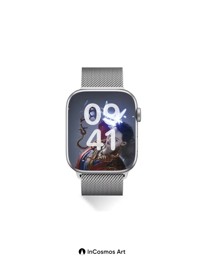 Debug product.metafields.custom.desc: Did you know ancient Chinese artisans once used mercury to create reflective surfaces in ritual mirrors? Here, light crawls like liquid silver over a crimson robe, while a serpentine energy coils from the fingertips, sparking against a storm-lit void. Your gaze lingers on the intricate embroidery—golden dragons breathing fire into frost—and the way her hair floats as if caught in an invisible wind.