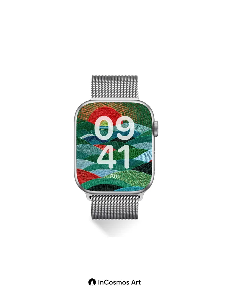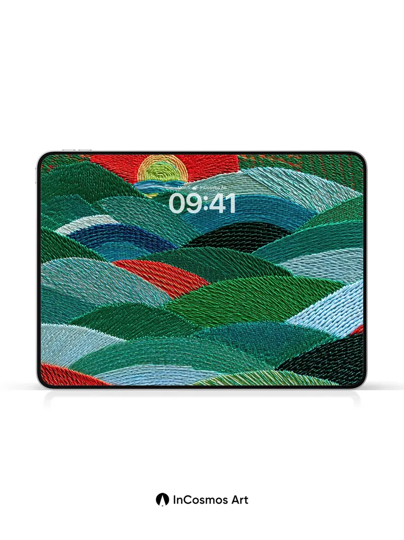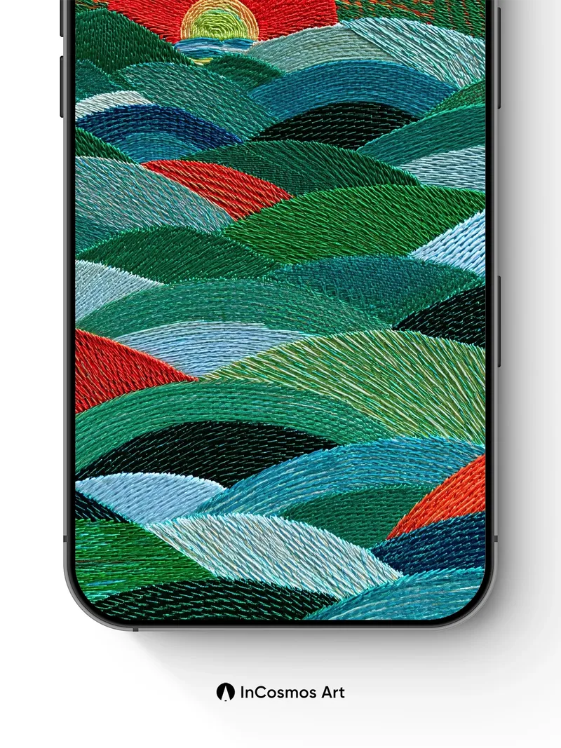 Debug page_description: Did you know embroidery threads can capture the movement of light across rolling hills? Here, each thread hums like a living current, weaving sunset into mountain ridges with precision that feels both ancient and electric. The sun doesn’t just set—it breathes fire into the sky, while layered waves of emerald and indigo ripple beneath like a dream made tactile. Share this with your best friend. Send this to your love and swap a matching set. What if every wall could hold a quiet heartbeat?