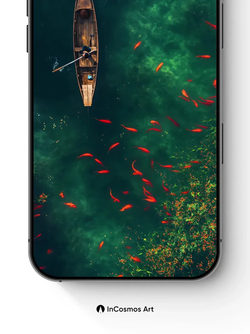Emerald Drift Wallpaper with Crimson Fish