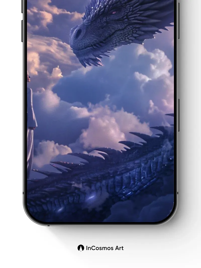 Did you know that ancient mythologies often depicted dragons as guardians of celestial realms? Here, a luminous silver dragon coils through cloud-strewn skies, its scales shimmering like frosted glass under twilight’s breath. A solitary figure in flowing robes stands poised on its back, not as rider but as companion—both bound by silent understanding beneath an endless dome of lavender and gold.
