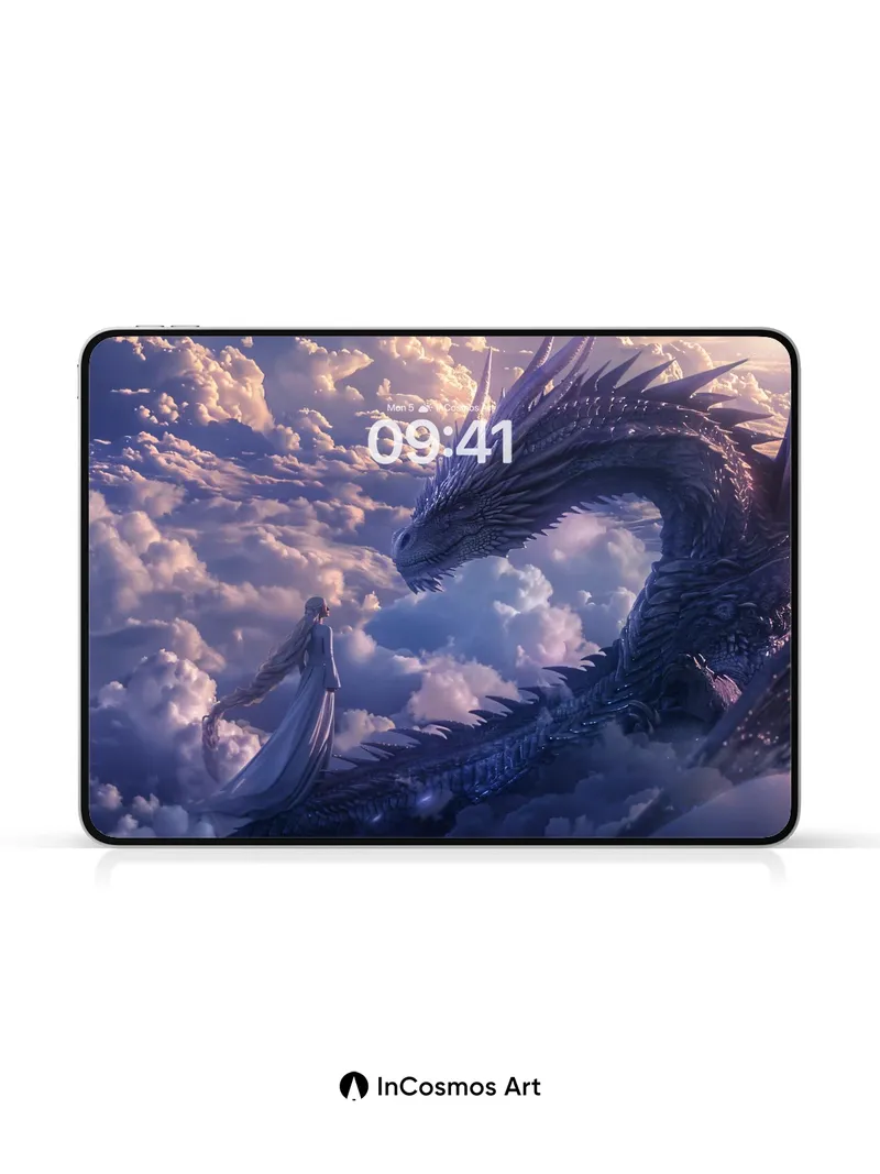Debug page_description: Did you know that ancient mythologies often depicted dragons as guardians of celestial realms? Here, a luminous silver dragon coils through cloud-strewn skies, its scales shimmering like frosted glass under twilight’s breath. A solitary figure in flowing robes stands poised on its back, not as rider but as companion—both bound by silent understanding beneath an endless dome of lavender and gold. Share this with your best friend. Send this to your love and swap a matching set. What if the sky wasn't just above you, but waiting to carry you?