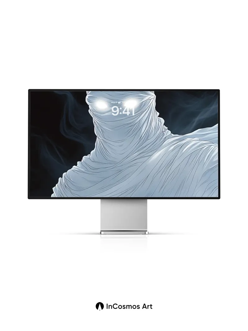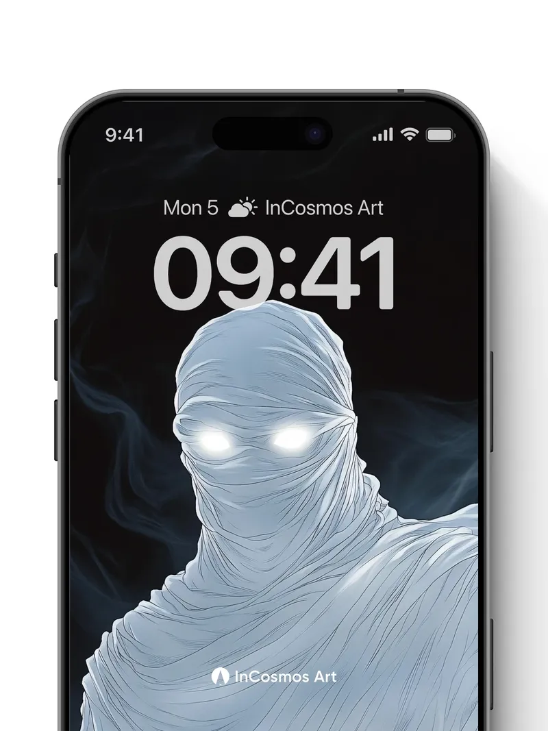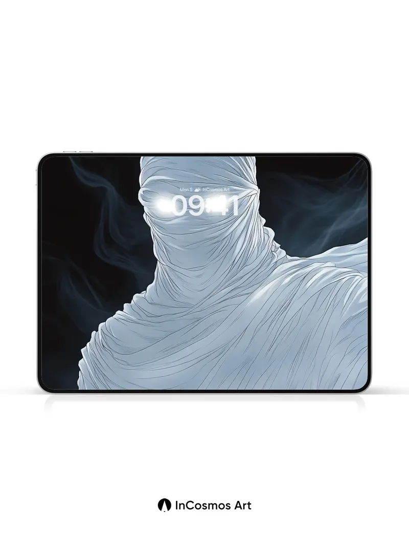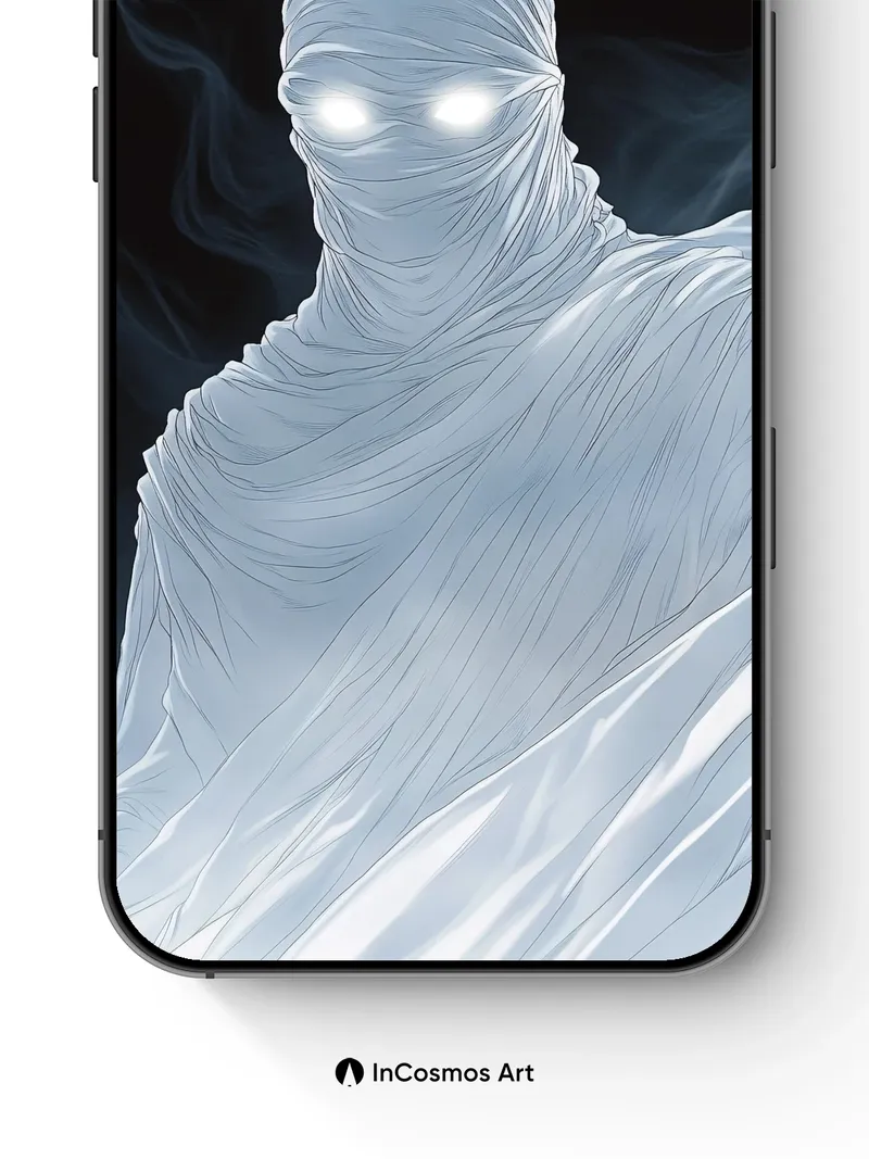 Debug product.metafields.custom.desc: Did you know ancient Egyptian mummies were wrapped in linen to preserve the soul? Here, light crawls over translucent fabric like breath, each fold whispering secrets of forgotten tombs. The eyes burn with a cold, silent fire—neither alive nor dead, but watching. You feel the weight of silence pressing from behind the cloth, as if the veil itself is breathing.
