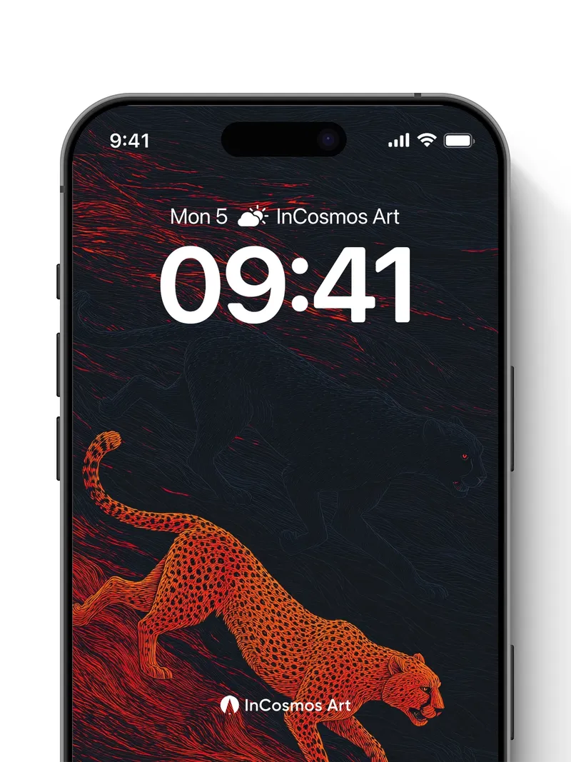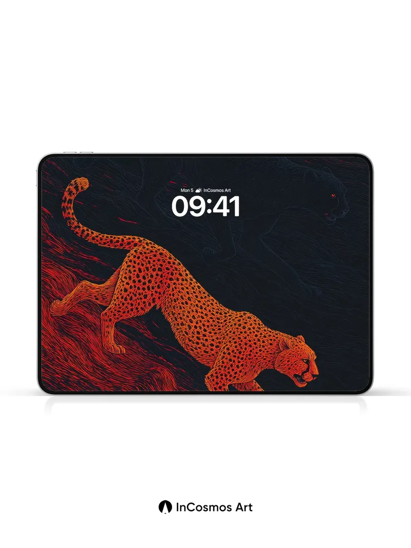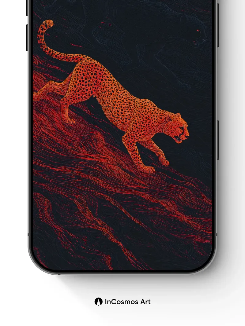 Debug page_description: Did you know cheetahs can accelerate from zero to 60 mph in just three seconds? Here, their form blazes across a terrain of molten red lines that pulse like veins beneath dark earth. The animal’s spotted hide glows with an inner fire, while a ghostly silhouette looms behind—silent, watchful, eternal. Light crawls over its muscles as if drawn by hand, each stroke alive with tension and motion. Share this with your best friend. Send this to your love and swap a matching set. What if the night had a heartbeat?